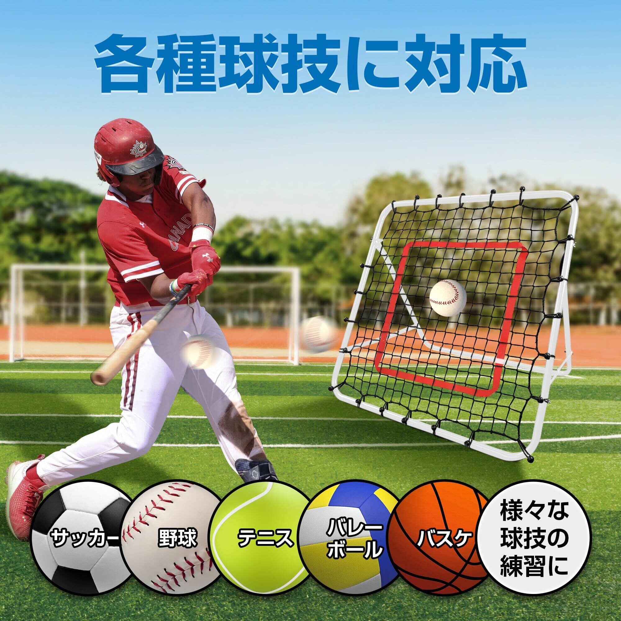 このリバウンドネットは、屋内や屋外で手軽に設置でき、フレームの角度も自由に調整可能。頑丈なスチール製フレームと弾力性・耐候性に優れたネットが採用され、安定感抜群。付属のペグで地面に固定すれば、倒れる心配もないです。野球、テニス、サッカー、ソフトボール、ホッケー、ゴルフ、バドミントンなど、多岐にわたる球技スポーツに適しています。自宅での壁打ちやキックの練習はもちろん、シュート練習などにも利用可能。ボールが戻ってくるため、一人での効果的な練習が可能で、キック、トラップ、パスの反復練習に最適です。セットにはフレーム、ネット、ゴムフック、ペグ、組立説明書が含まれています。