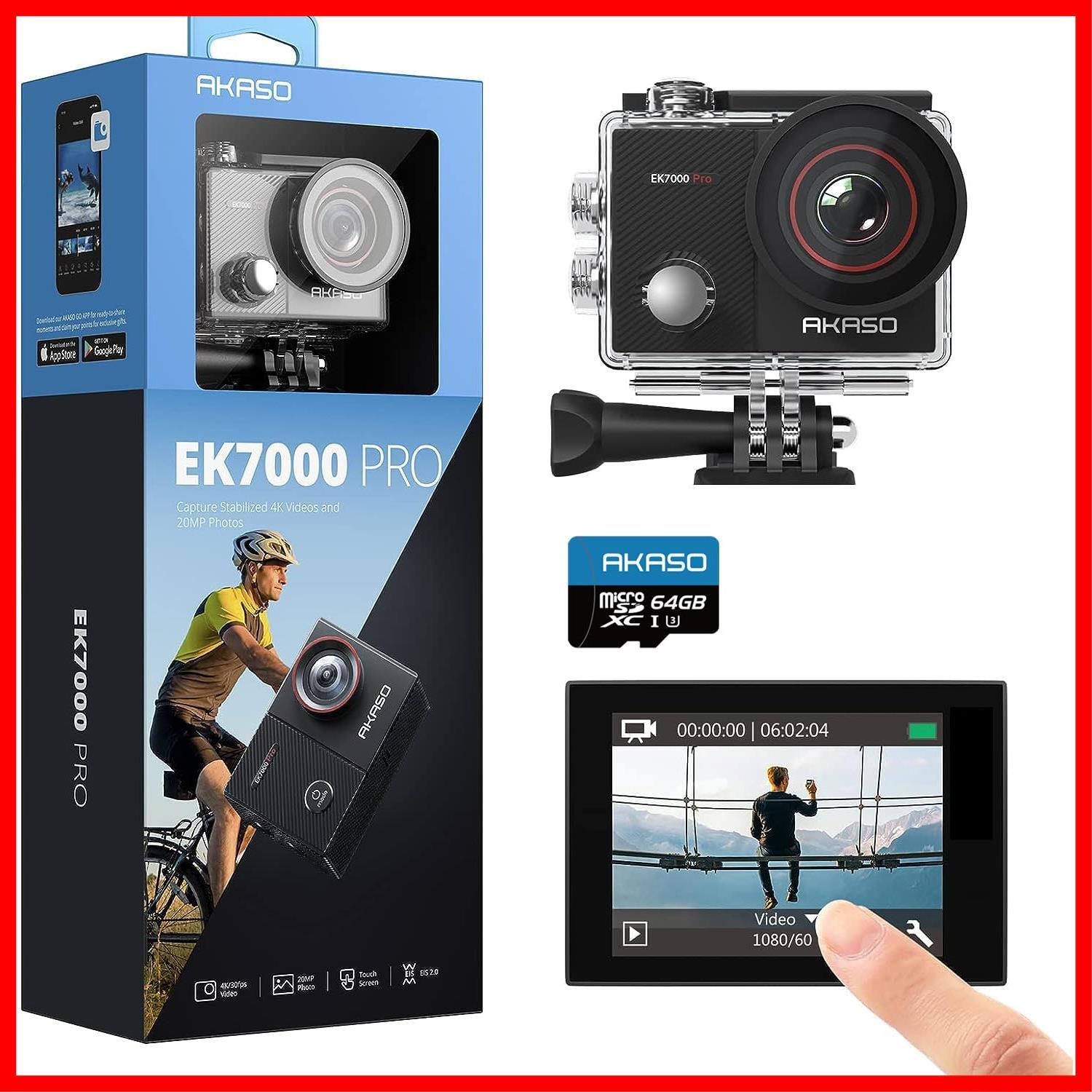 AKASO EK7000 Pro 4K アクションカメラ + 64GBメモリカード 2000万画素 タッチパネル式 Type-C外部マイク対応 手ブレ補正 WIFI搭載 広角レンズ 40m防水 水中カメラ HDMI出力 スポーツカメラ リモコン付き 2つ1050mAhバッテリー 豊富なアクセサリー ウェアラブルカメラ
