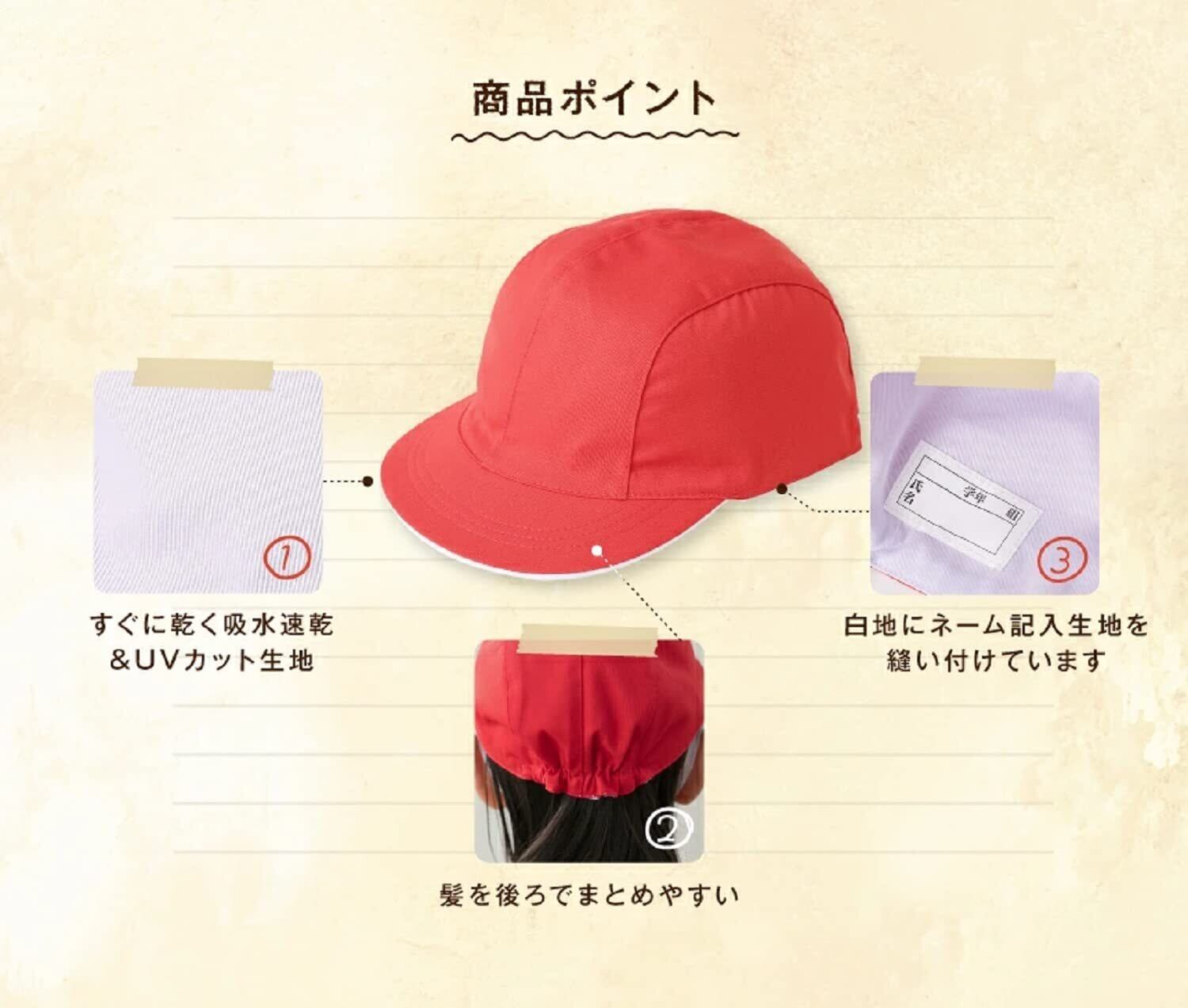 定番の女の子用の赤白帽子 髪を帽子に入れやすいよう後頭部にゆとりを持たせています。 UVカット機能を備え運動会や体育の授業、外出時の着用に最適です。