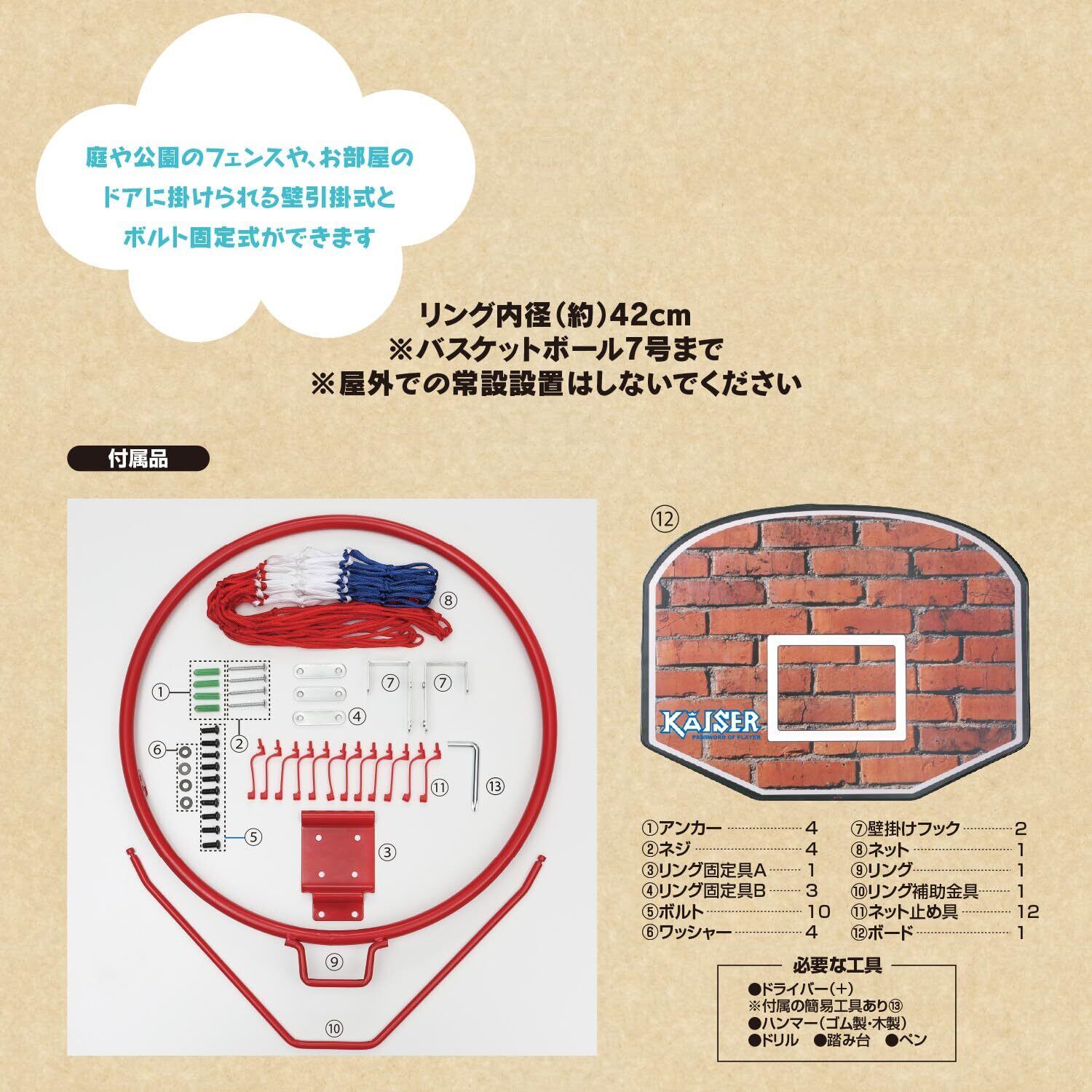 リング内径(約):42cm(バスケットボール7号対応) ボードサイズ(約):800x600mm