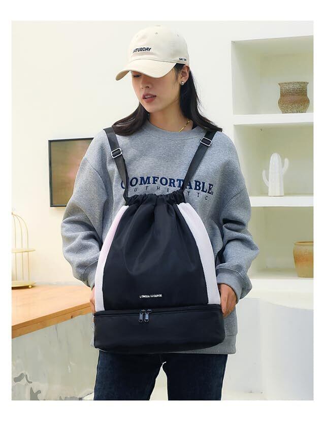 【様々な場合に活躍多機能リック】ヨガ、ジムの室内スポーツ用のジムバッグや水泳とスイミング教室用の防水プールバッグや部活動、ビーチ遊び、海水浴場、銭湯ホテル、温泉旅行、修学旅行、花火大会、お祭り時のお着替えシューズと衣類収納のリックサックなど様々なシーンにも活躍する多機能のナップサックです。