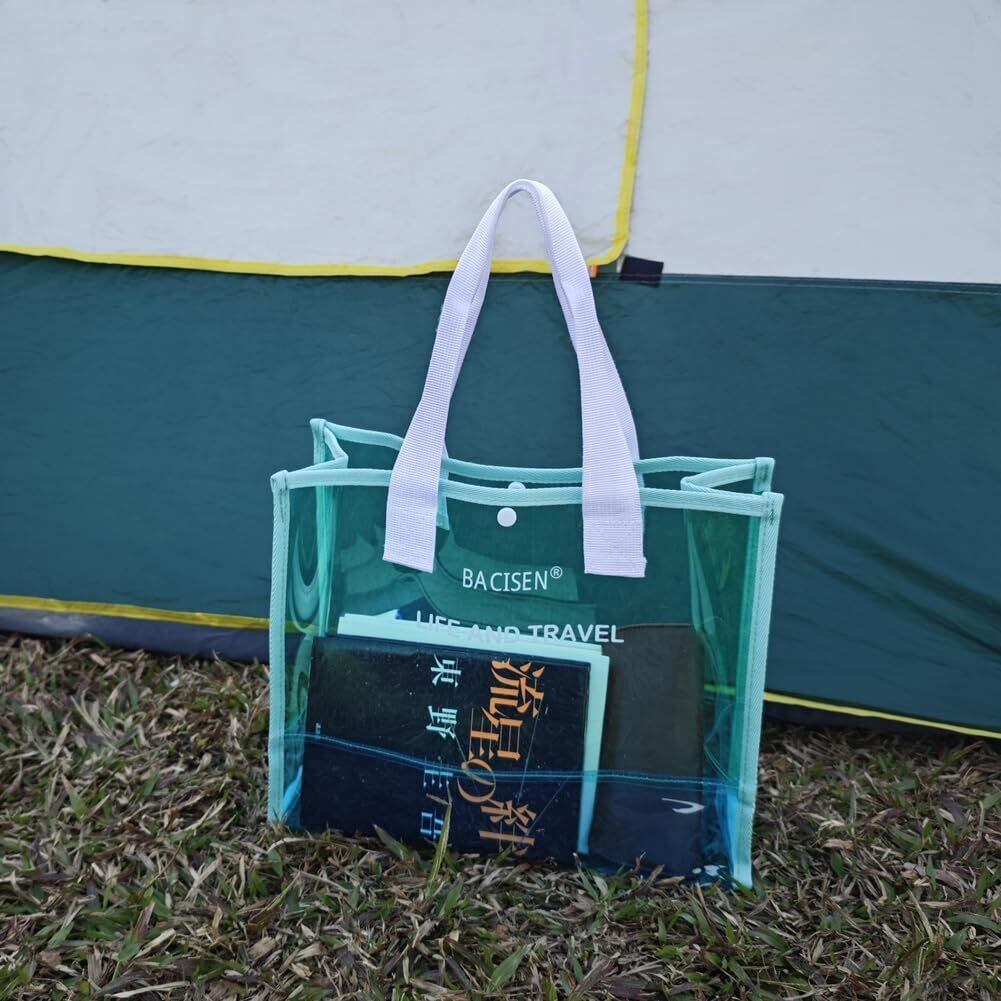 【濡れても大丈夫な透明バッグ】耐水性PVC素材を採用した上、精密な縫製テクニックを利用して、しっかりとした生地です。雨の日にもバッグの中身を湿すことは心配いらないです。上部スナップボタン付で簡単に留められるから中身が飛び出さなくて安心です。また、透明のデザインなので、バッグの中身がひと目で確認できます。通学、プール、キャンプ、お花見、ジム、運動会、温泉用のバッグなどとしても活躍します。