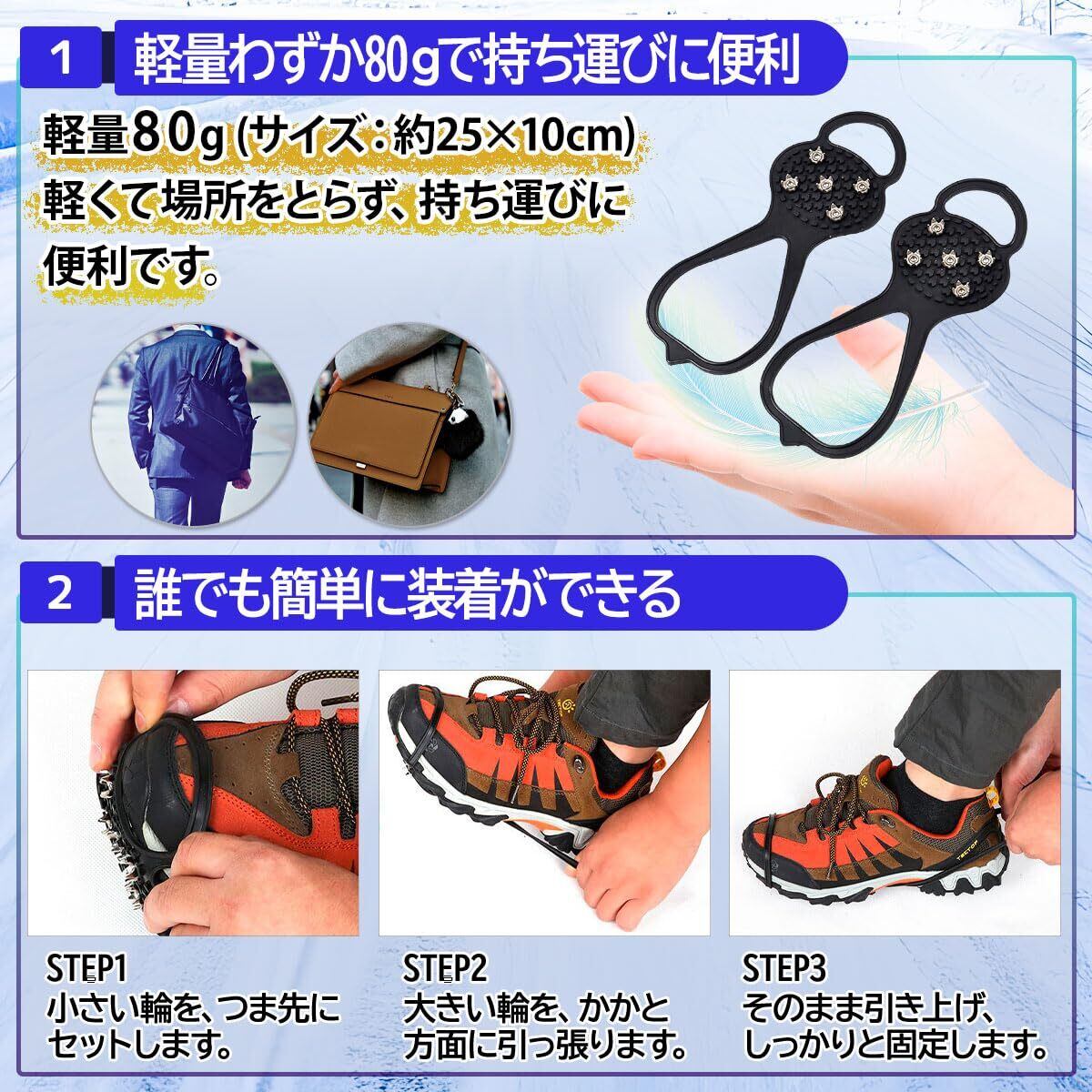 アウトドアの他、凍結路面や雪道を歩くための装備として活用できます。
