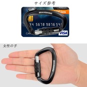 【オートロック カラビナ】ゲートを右回して押すと、カラビナが開きます。ゲートが最大限に押される場合、手をすばやく離すとゲートが自動的に戻ります。意図せずロックが解除されることがなく、安全性は抜群に優れています。ご注意:片手で操作するのは難しいです。