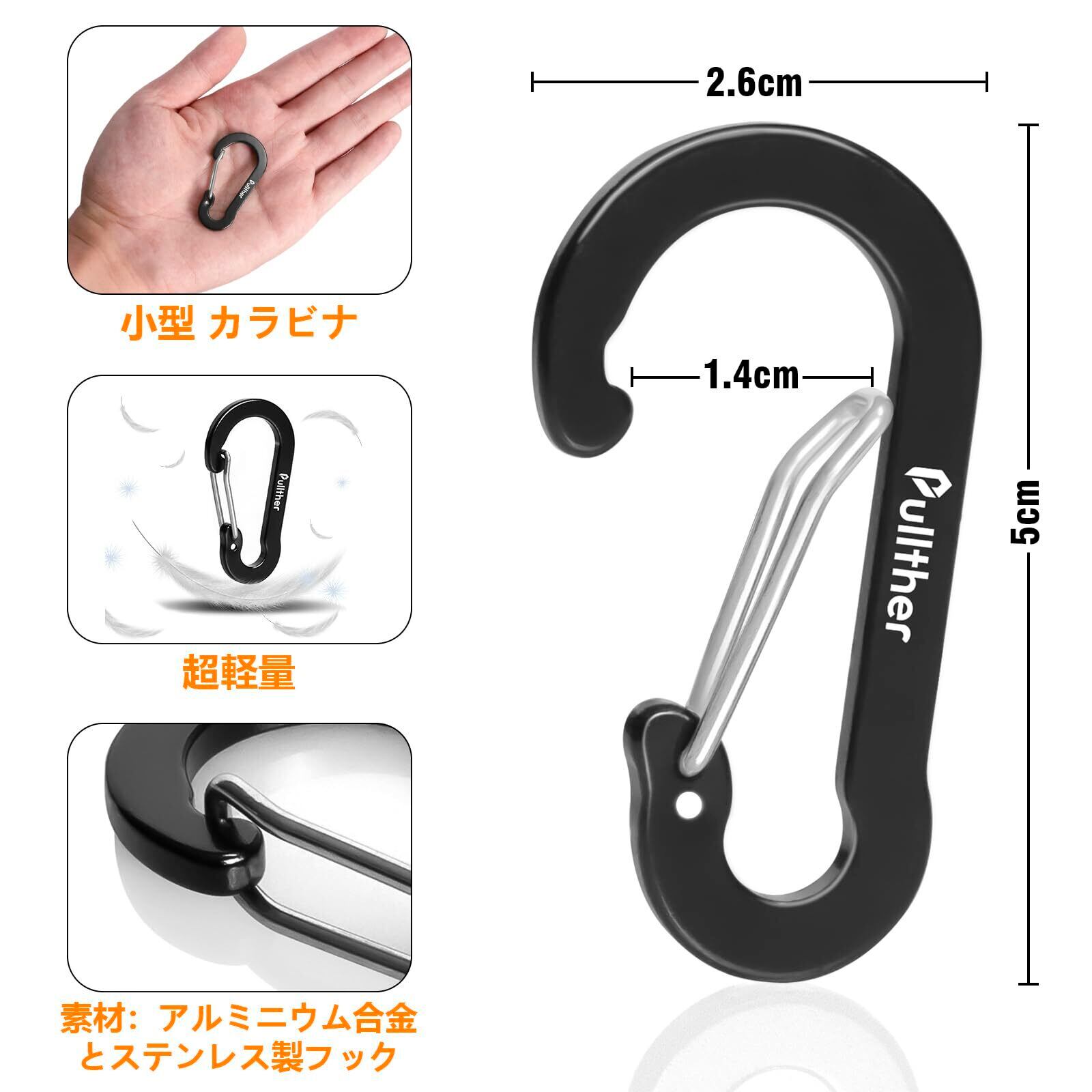 Pullther カラビナ 小型 5cm 超軽量 錆びない アルミ合金 アウトドア ガイロープ カラビナ 釣り 20個