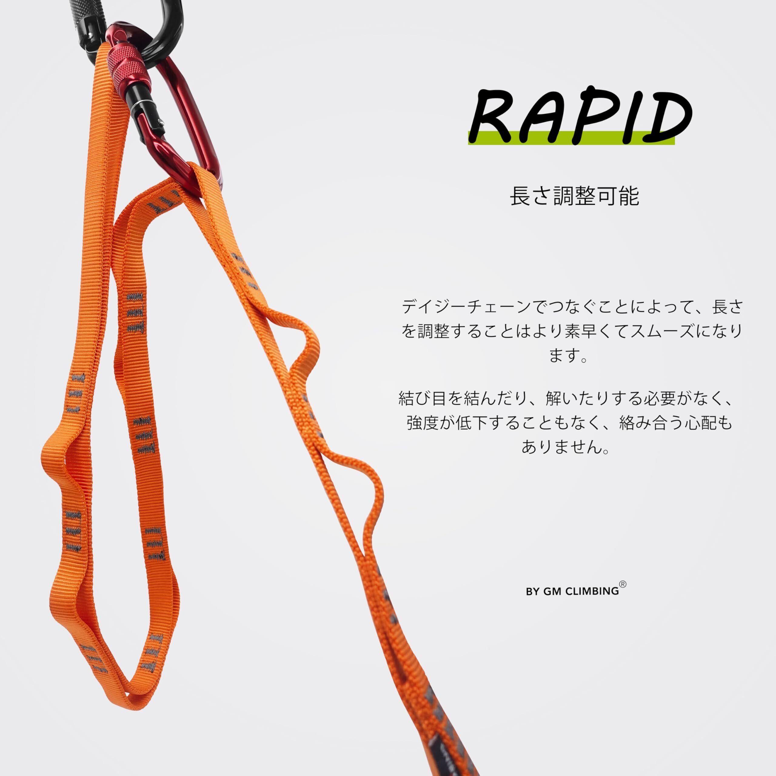 GM CLIMBINGの120cmデイジーチェーン。全長強度は22kNまで達し、計12個のループにより構成されます。クライミング、エイドクライミング、リギング、ラッペル、懸垂下降、高所作業、ハイキング、空中ヨガなど多目的に使用できます。