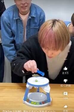 リンクが破れてビー玉が落ちた時にトングを持っていた人が負け。