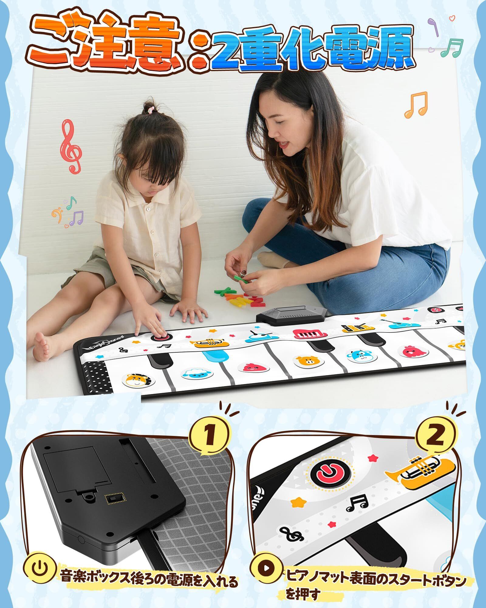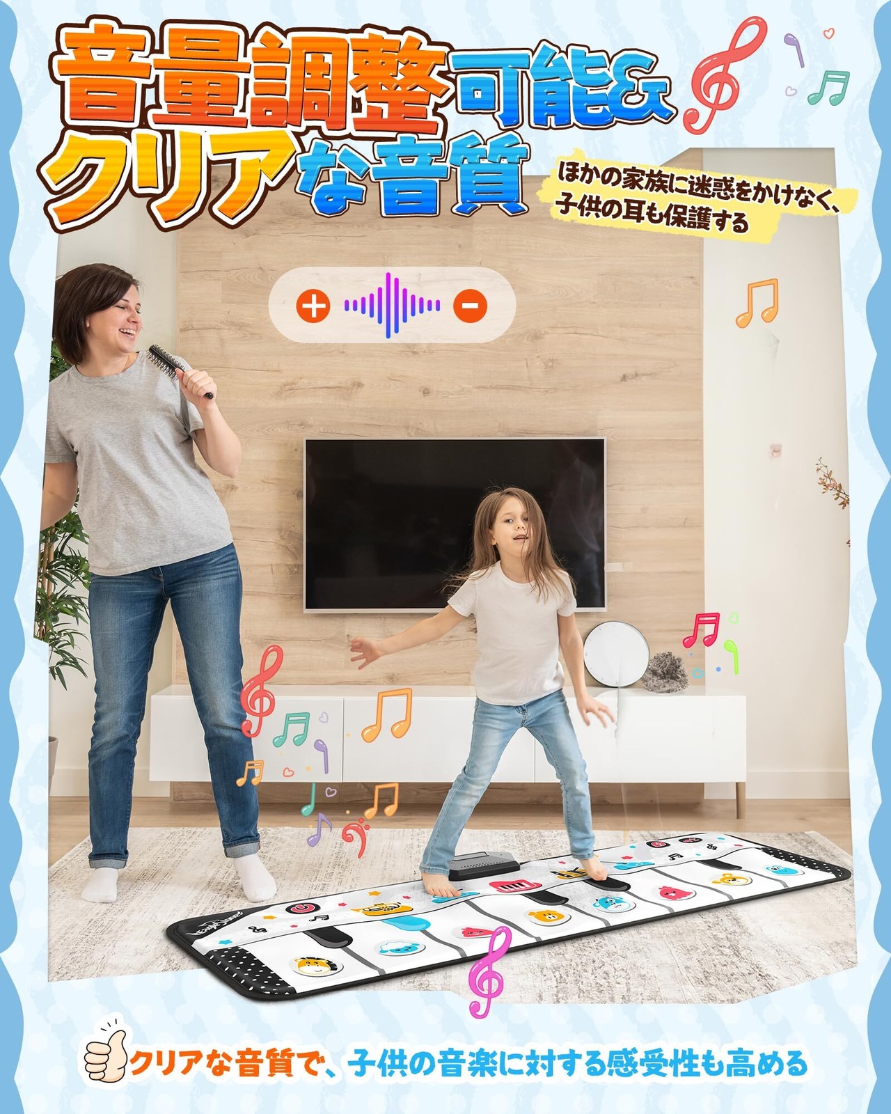 【音量調整可能&クリアな音質】ピアノマットには音量調整ボタンが付いています。場合により、音量調整ができます。ほかの家族に迷惑をかけなく、子供の耳も保護します。また、クリアな音質で、子供の音楽に対する感受性も高めます。