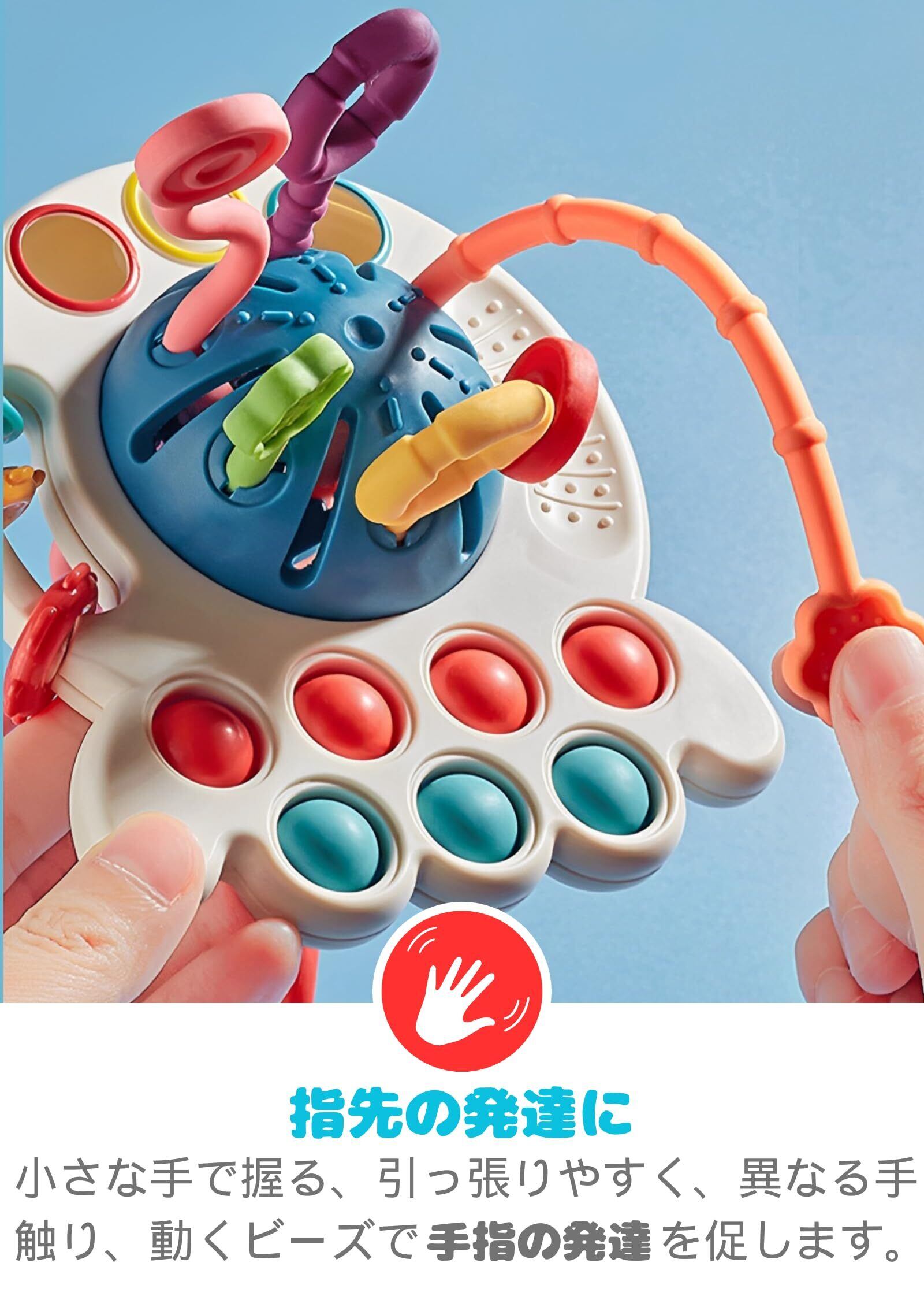 【知育プロ推薦】赤ちゃん 玩具0歳 ひもおもちゃ シリコン材質 ベビーカーに掛ける 【引っ張る・押す・嚙む・指先トレーニング】 (たこ模様)