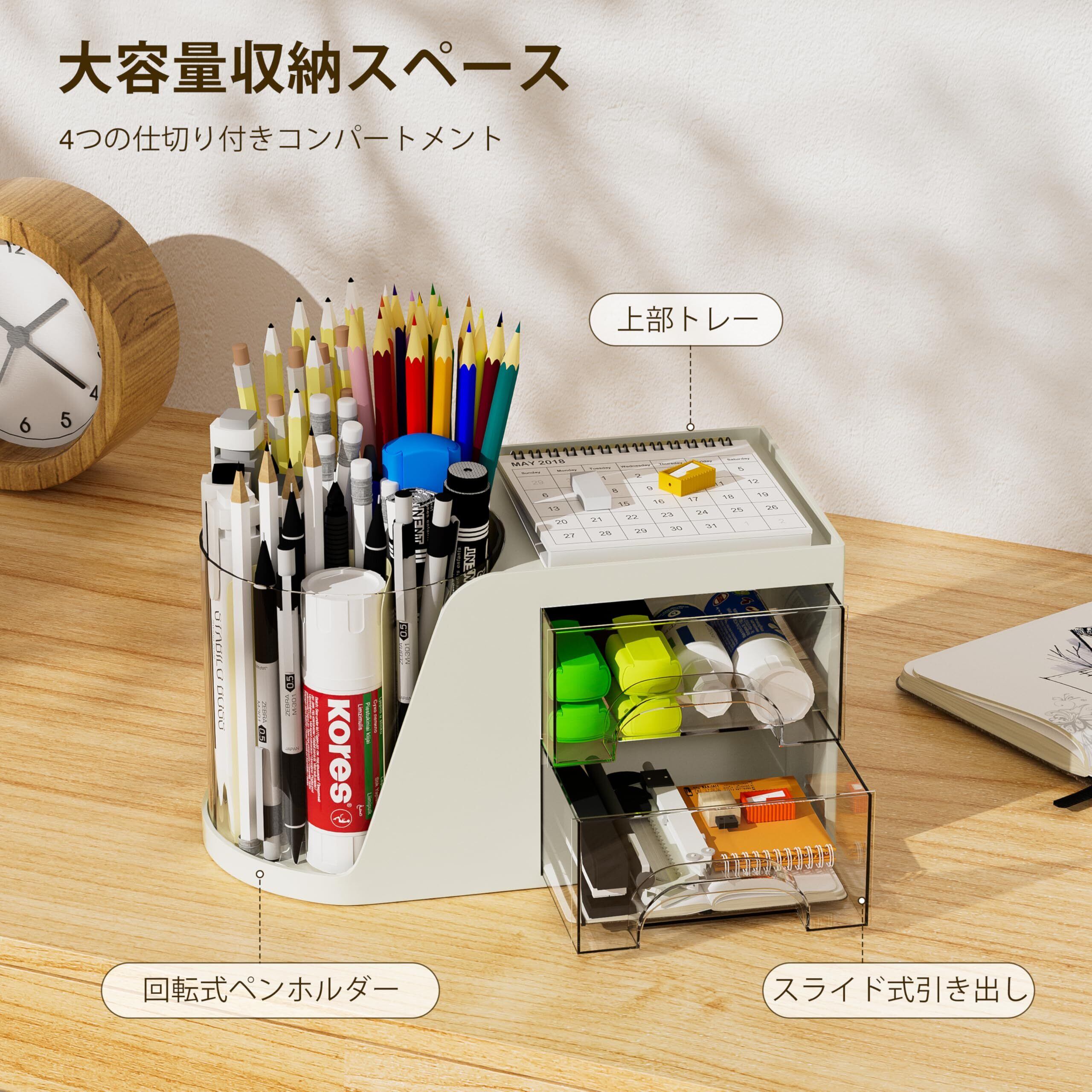 回転卓上収納ボックス オーガナイザーバッグ ペンホルダー 引き出し付き 多機能 大容量 分類収納 書斎 オフィス化粧台 (白)