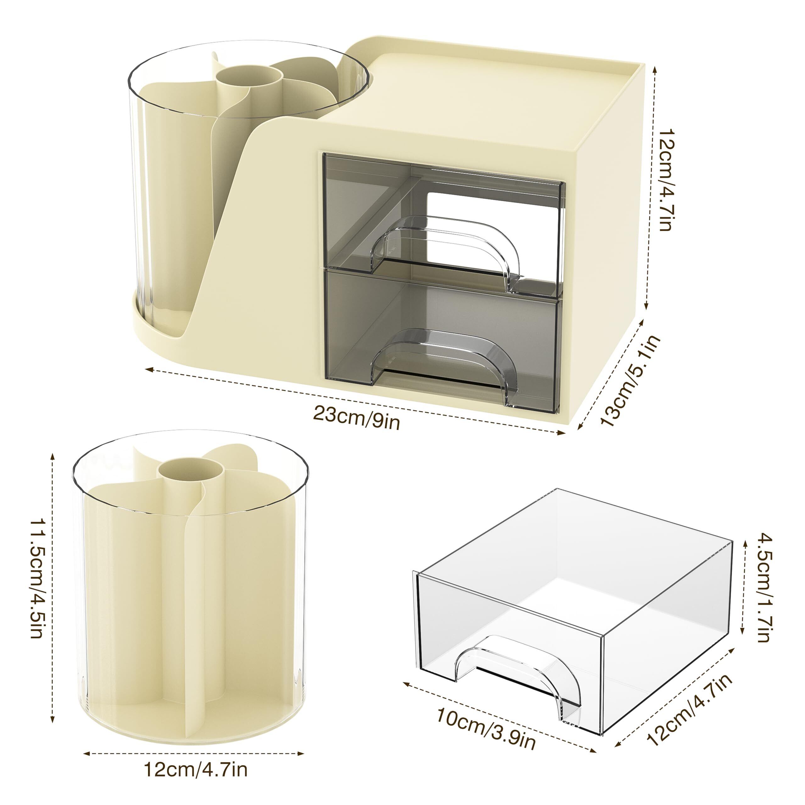 【数量限定】(黄色) オフィス、学校、家庭画材用 文具アクセサリー収納ボックス 引き出し2個、スロット6個、多機能鉛筆ホルダー、デスクトップ化粧品収納ボックス 回転デスクトップ収納ボックス