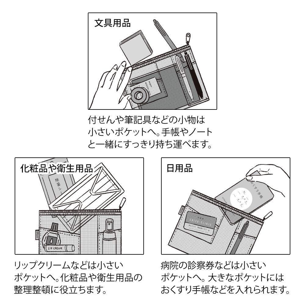 ステーショナリー:付せんや筆記具は小さいポケットへ。B6サイズまでのノートや手帳とまとめて収納できます。