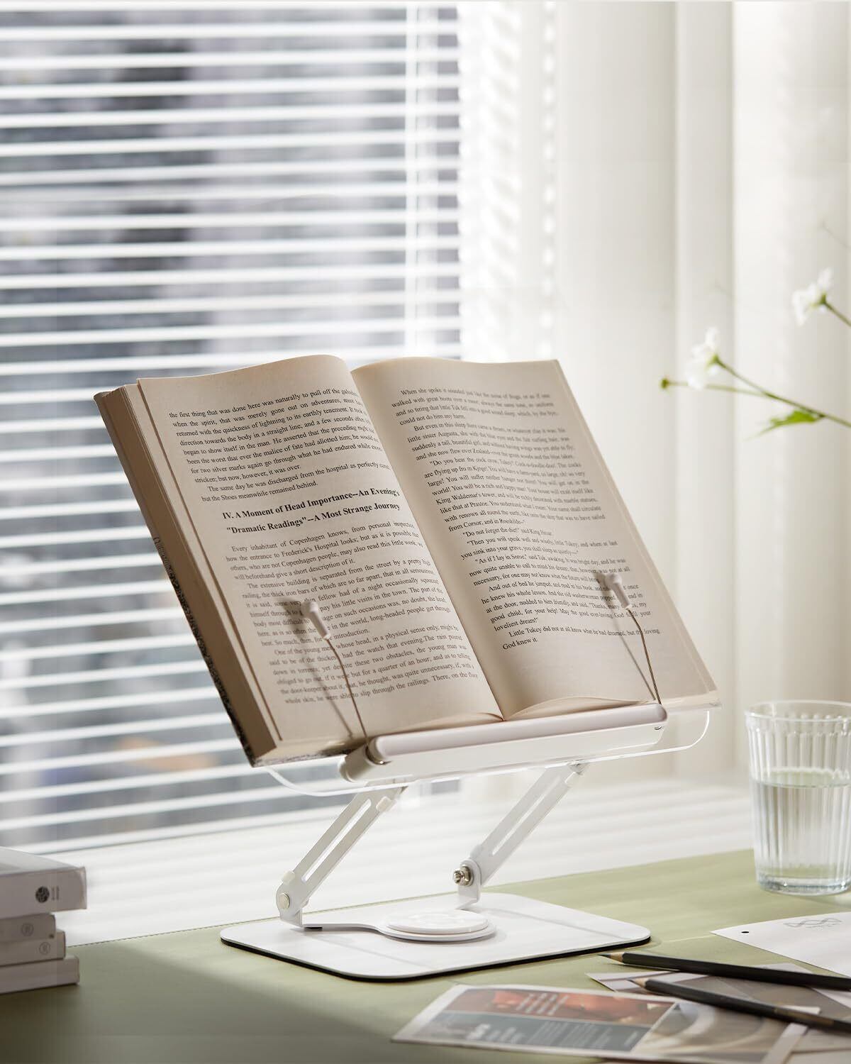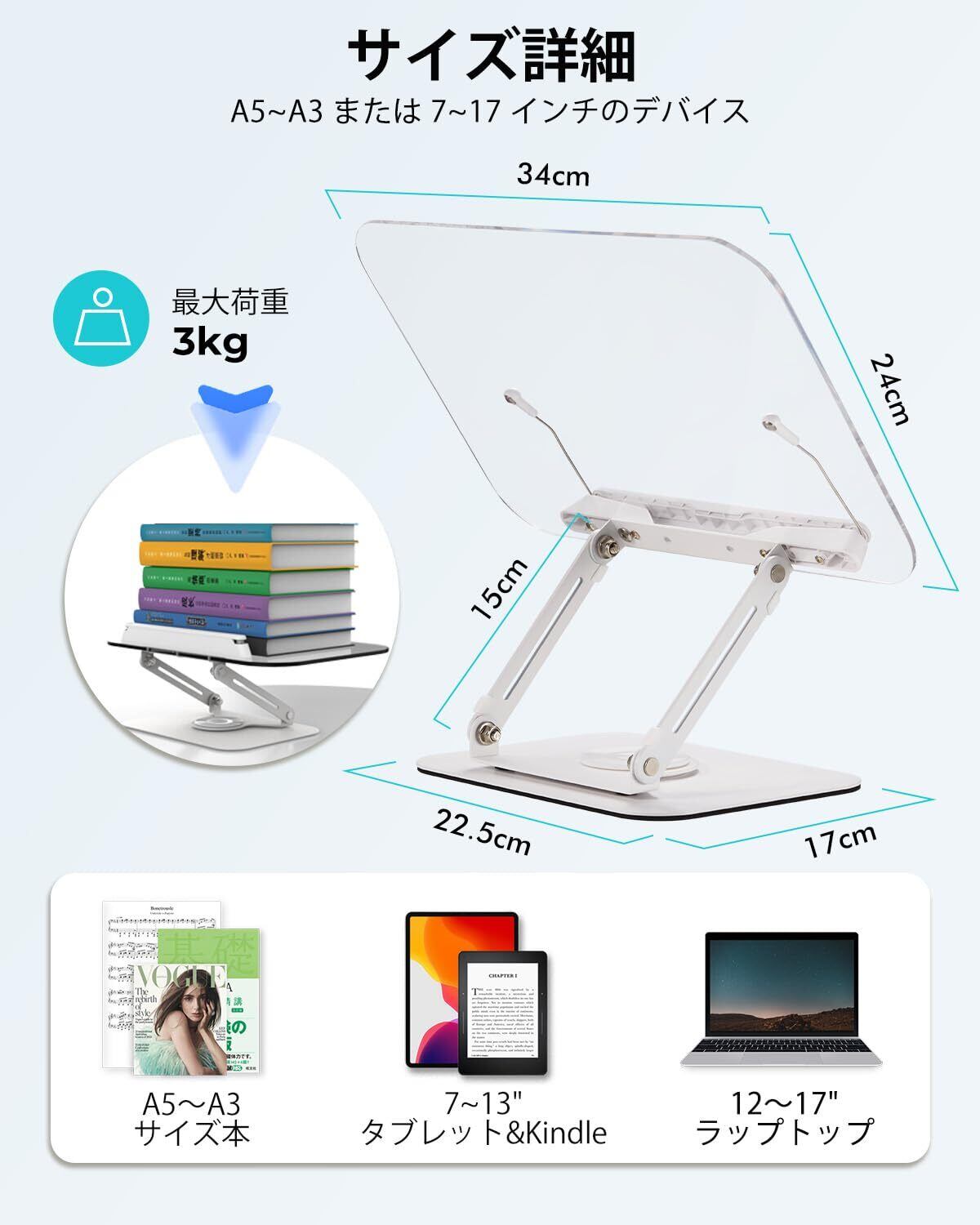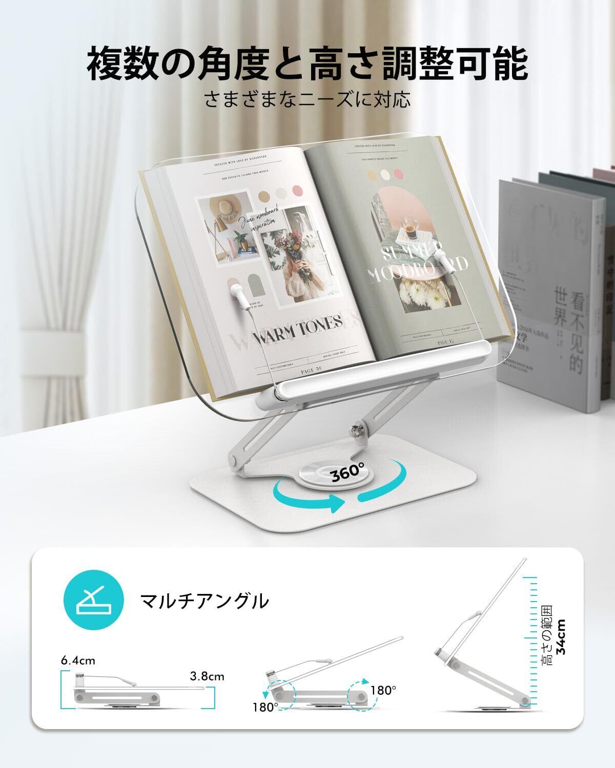 【調整&回転可能】ベースは円滑な360°の回転が可能で、最適な本の閲覧角度に調整するための便利さを提供します。ボード自体は約120度のスイング範囲があります。高さ調整範囲は3.5-34 cmで、本を視線に合わせます。首、肩、腰への負担を軽減するのに役立ちます。