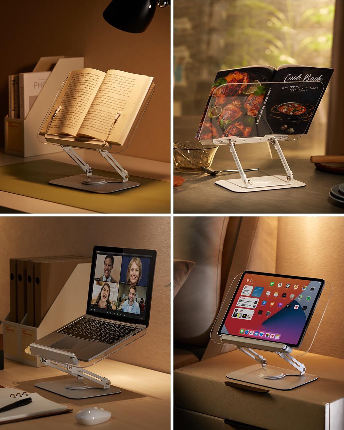 viozon アクリル製ブックスタンド 書見台 読書用、料理本ホルダー、筆記台 本立て、高さと角度調整可能、360°回転ベース、折りたたみ可能 持ち運び便利、軽い、オフィス、キッチン、学校の教科書、レシピ、雑誌、タブレット、ラップトップ