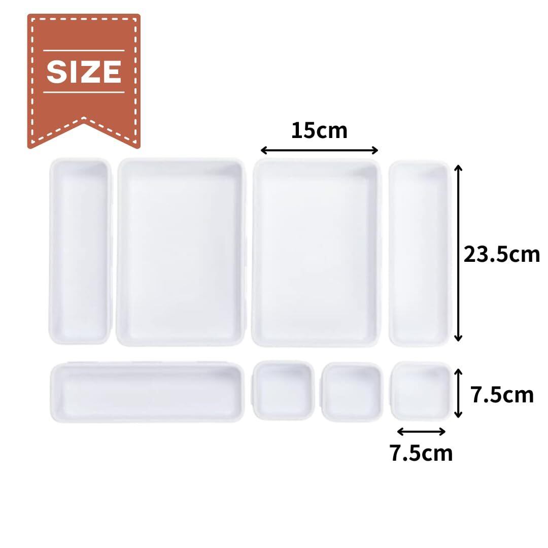 【商品詳細】サイズ:大長方形箱x2個 長さ23.5×幅15×高さ4.5 cm、中長方形箱x3個 長さ23.5×幅7.5×高さ4.5 cm、小箱x3個 長さ7.5×幅7.5×高さ4.5 cm