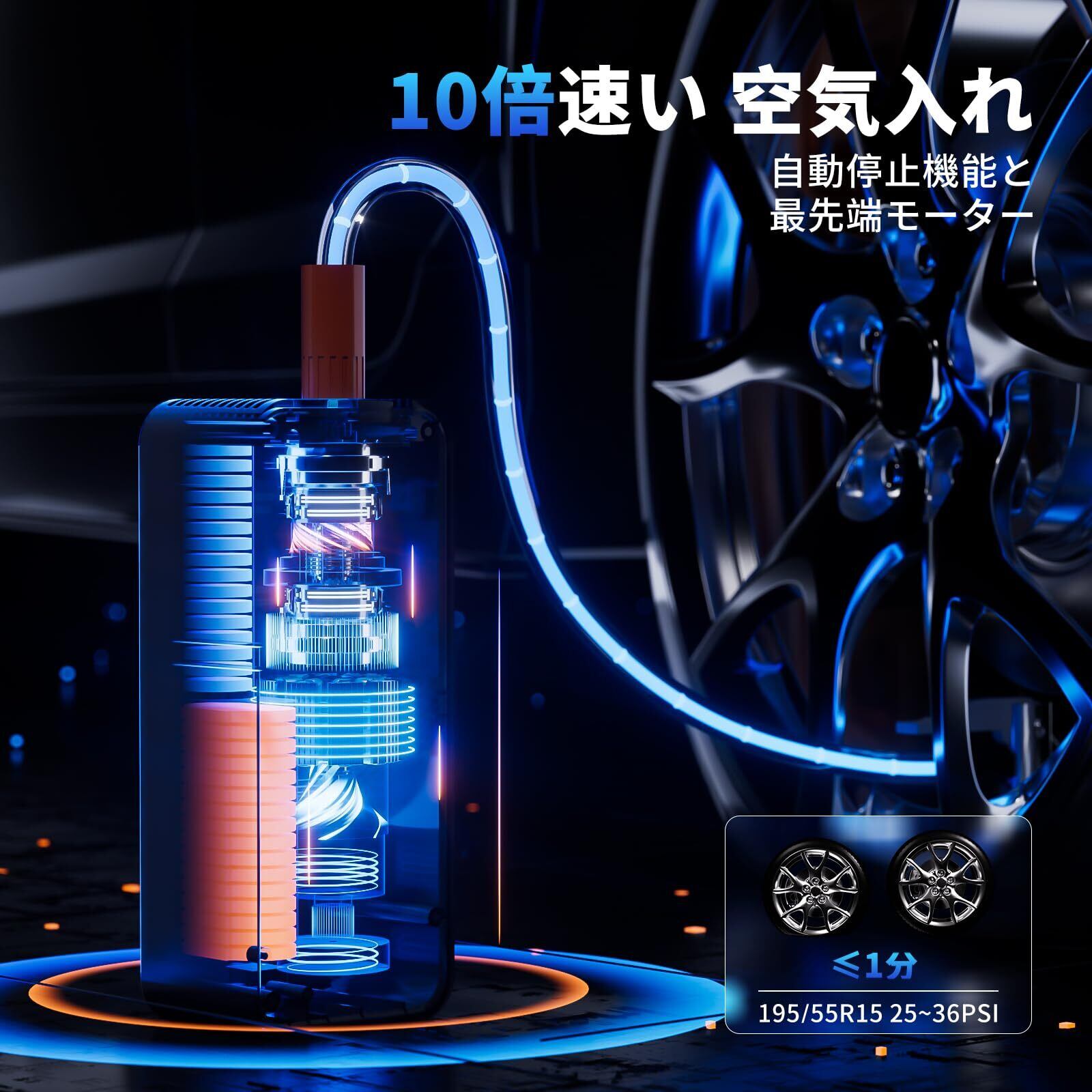 【自動OFF機能搭載&10倍速い空気入れ】コードレス空気入れは最大圧力150PSIに対応し、感知センサーと自動OFF機能を搭載し、予め空気圧をセットしておけば、指定した空気圧になると自動停止します。過剰膨張や空気不足の心配がありません。最先端のモーターを搭載し、毎分22000回転の効率が従来の電動空気入れより10倍も上がり、195/55R15のタイヤを6分で0から36PSIまで膨らませることができ、わずか1分で29から36PSIまでブーストすることができます。さらに、ロードバイクのタイヤに1分以内で空気を入れることができ、時間と労力を大幅に節約してスムーズな旅を実現する。