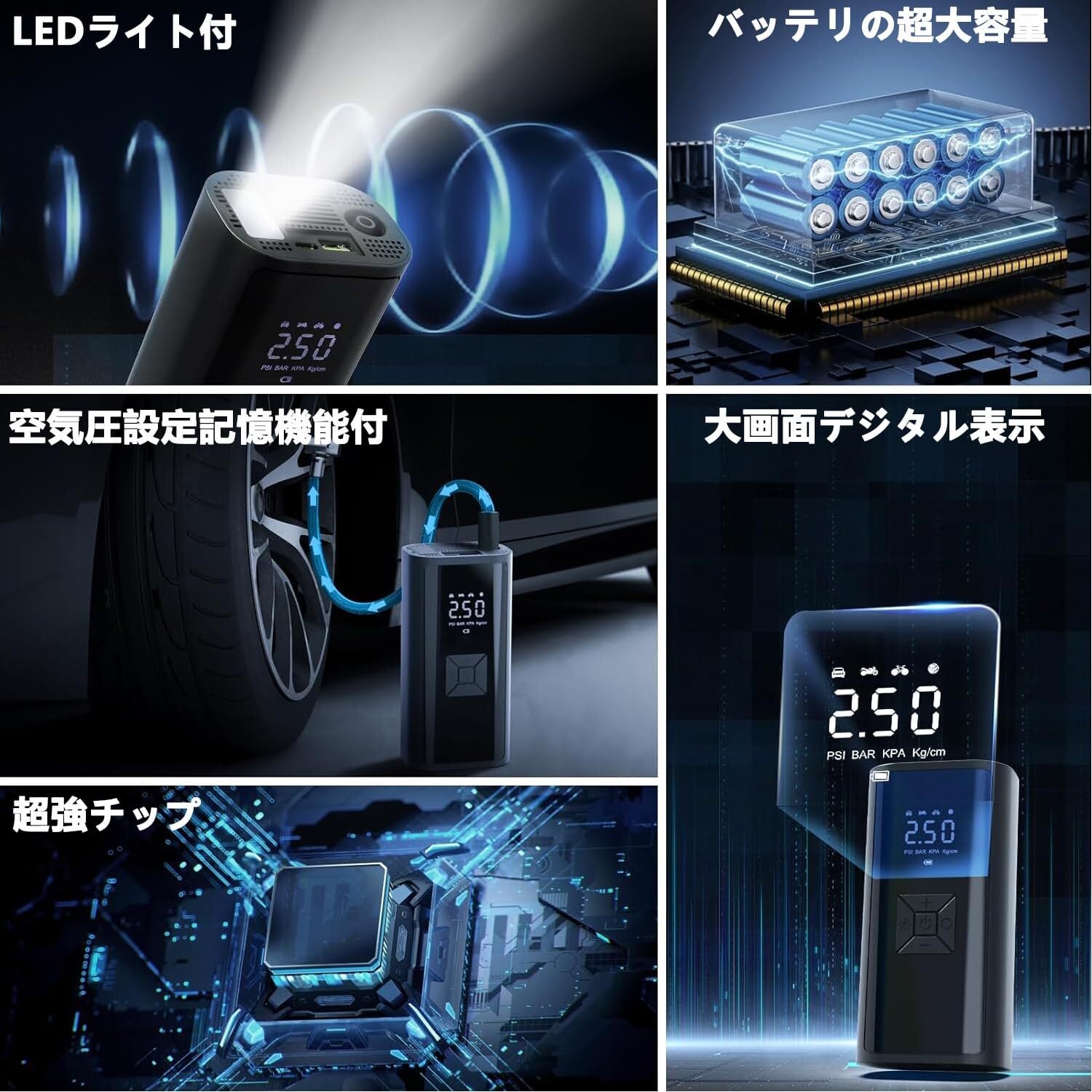 【数量限定】日本語説明書付き 機能付き SOS非常灯/LED懐中電灯 自動車/自転車/ボール/浮き輪/バイク/ボート/プール Type-c出力ポート急速充電 8000mAh 多機能電動空気入れ 最大圧力150PSI 自動停止 空気圧指定可 4種単位換算 多機能 電動 空気入れ バイク コードレス 充電式 車 自転車 【2024年新登場】電動空気入れ