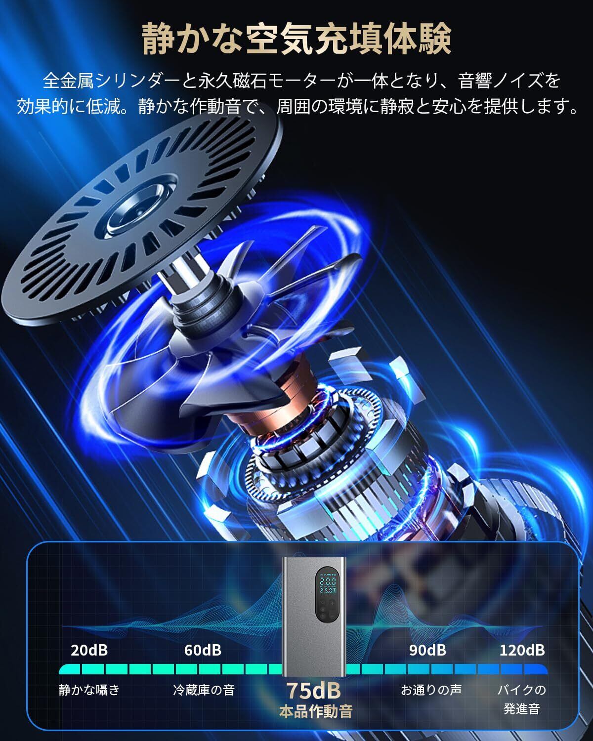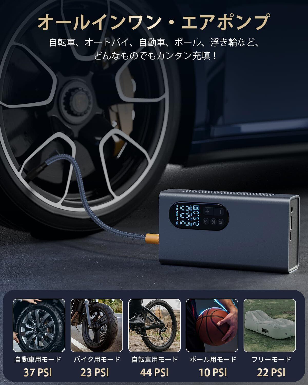 【五つの知能モード搭載&急速な熱放散】全種類の自動車、オートバイ、自転車のみならず、全てのボールやエアー玩具にも使えます。空気圧を最大150psi(10.3bar)までセットできるので、各種車タイヤに対応できるだけでなく、効率も大部向上します。コンパクトのエアーポンプ本体の左右両面に排熱穴を搭載しており、長時間使用しても熱くならない、安心してご利用ください。