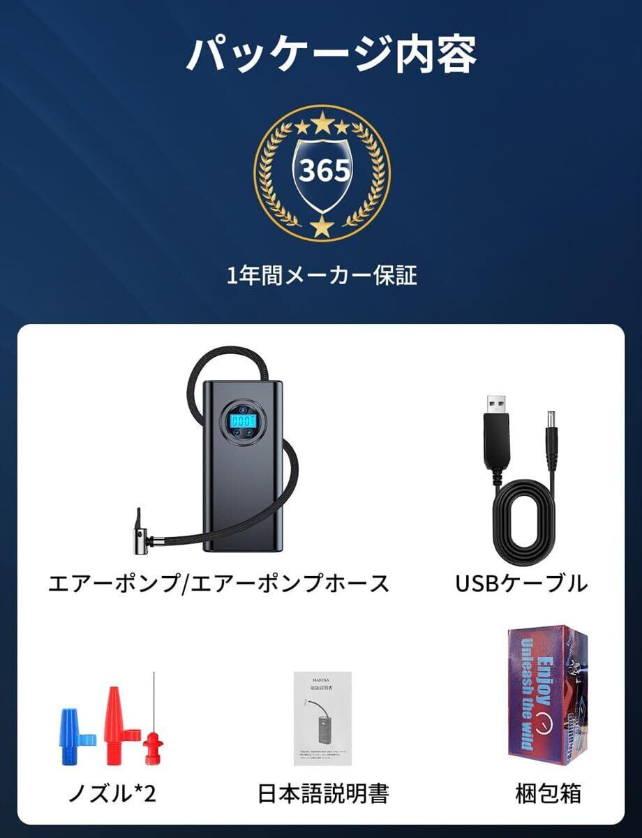 【保証期間】 パッケージ内容:電動エアポンプ、エアーポンプホース、USBケーブル、切り替えノズル*3、日本語説明書。6ヶ月間の保証:弊社は製品の初期不良、自然故障、通常使用における不具合には6ヶ月間の保証が対応しています。本製品の使用過程に、何か不明なところがあれば、いつでも連絡してください。ご注意:【初めて製品をお受け取りになった時、本体と部品は別々の状態になっていました。より良い使用体験のために、製品をご使用になる前に、本体とホース及びノズルがきちんとつながっているかどうかをご確認ください。】