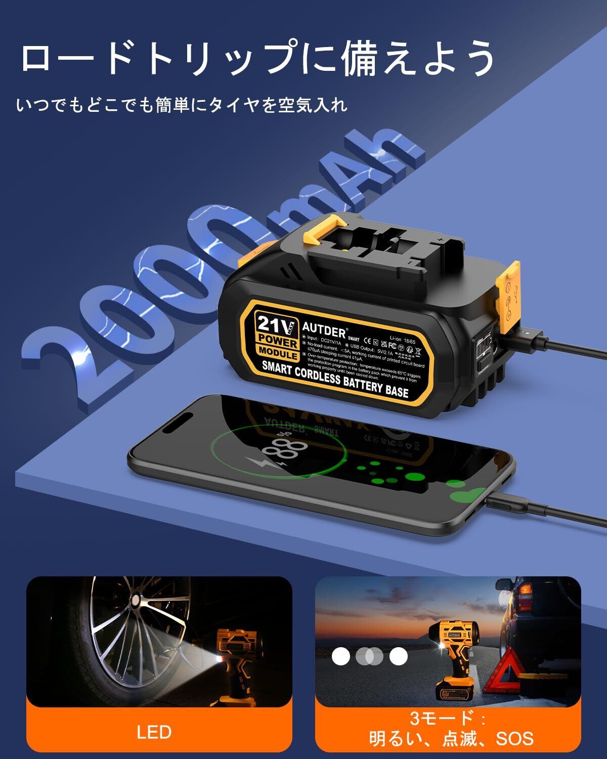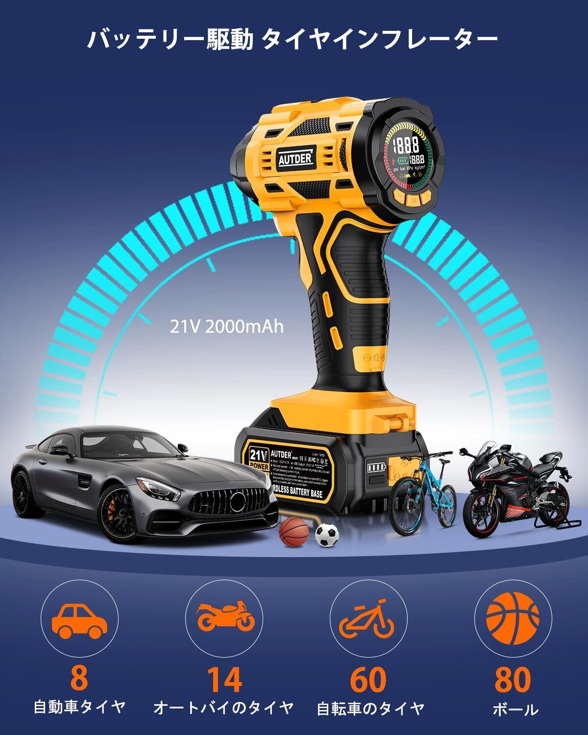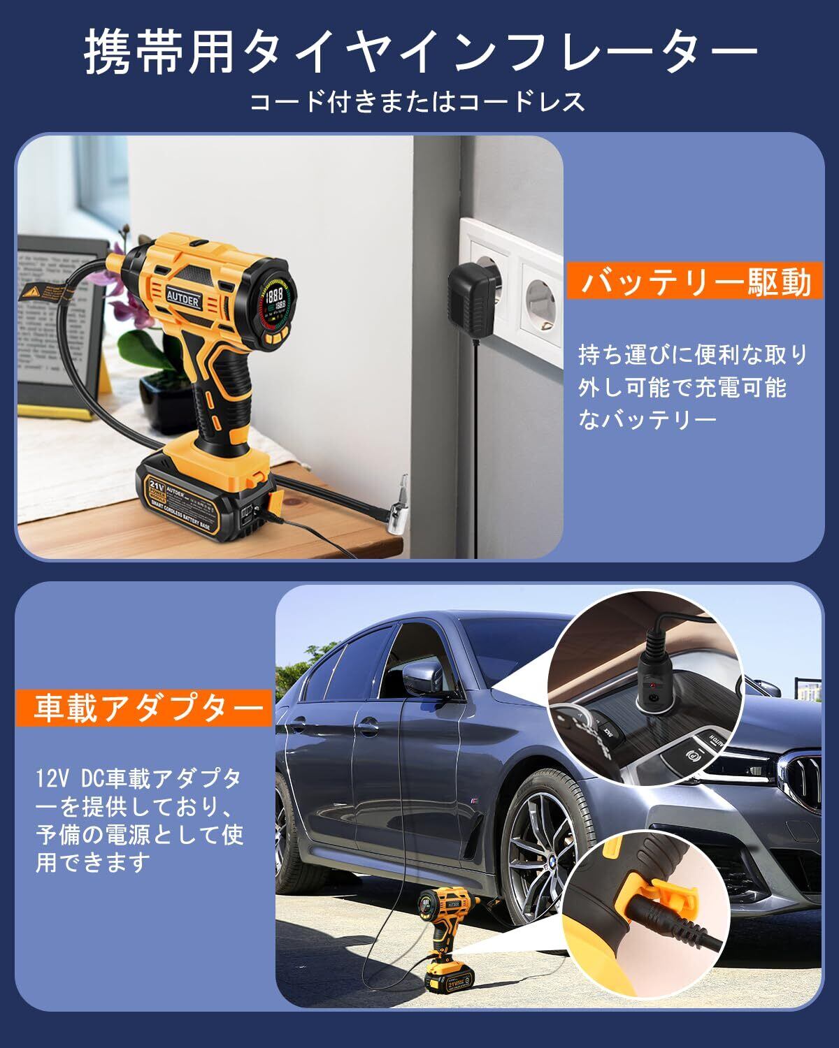 色:イエローポータブルエアコンプレッサー, コードレスタイヤインフレーター 180 AUTDER PSI, 21Vバッテリー/12V DC電源, デジタルゲージ, 自動停止機能, 携帯に最適 (イエロー)