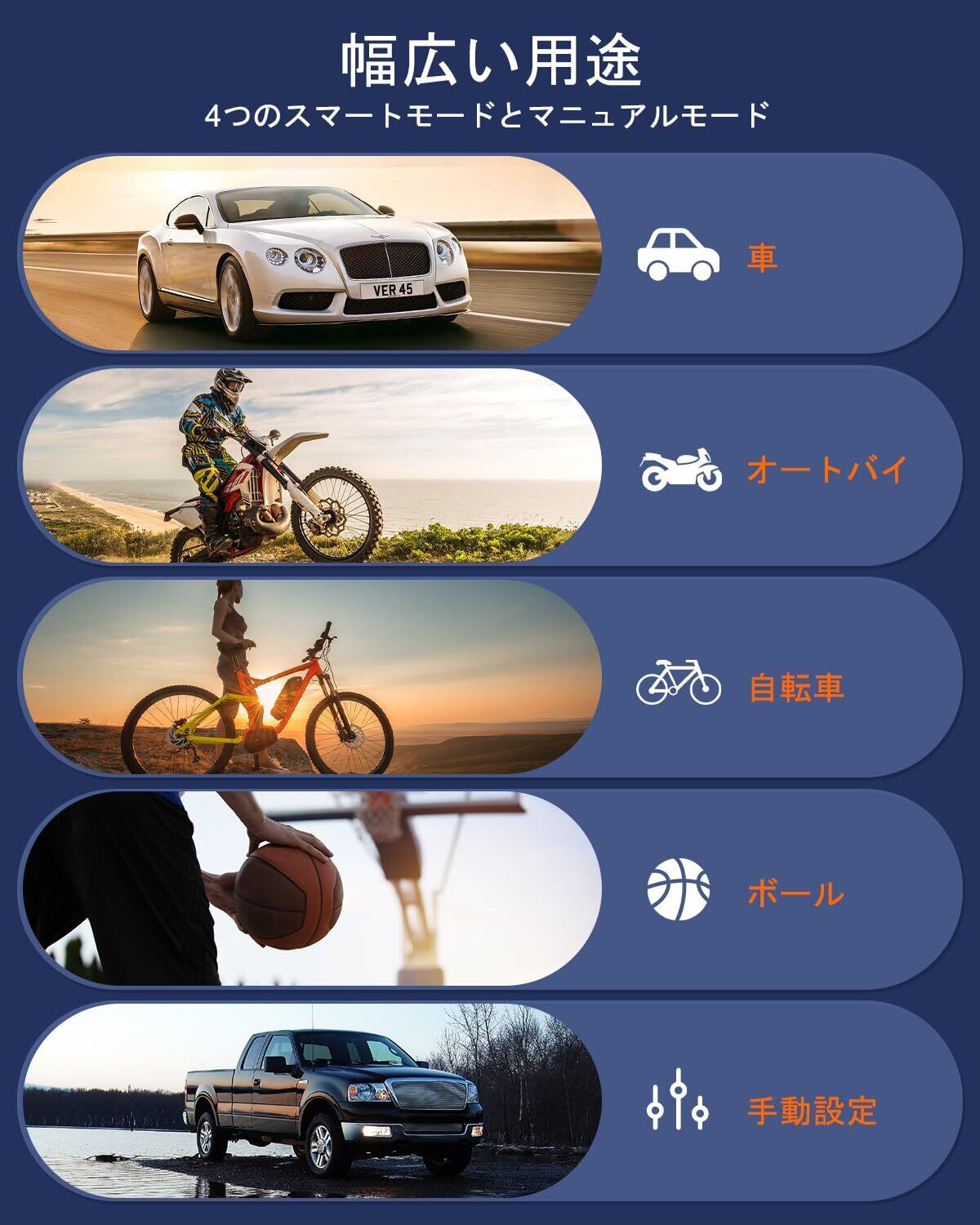 幅広い用途: AUTDER AD380タイヤインフレーターは、自動車、SUV、オートバイ、自転車、電気車両、ボール、小型のインフレータブル玩具など、さまざまな車両や物品に適しています; 大型トラックや農業機械には適していません; 完全充電で約8本の自動車タイヤ、14本のオートバイタイヤ、または60本の自転車タイヤをインフレートできます