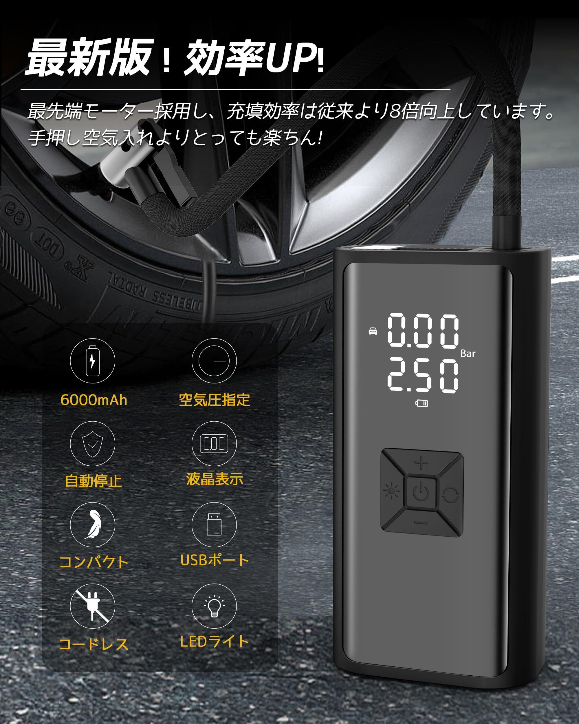 電動空気入れ 車 自転車 エアーポンプ 充電式 6000mAh コードレス 最大圧力150PSI バイクエアコンプレッサー 仏/英/米式バルブ対応 自動車/自転車/ボール/浮き輪