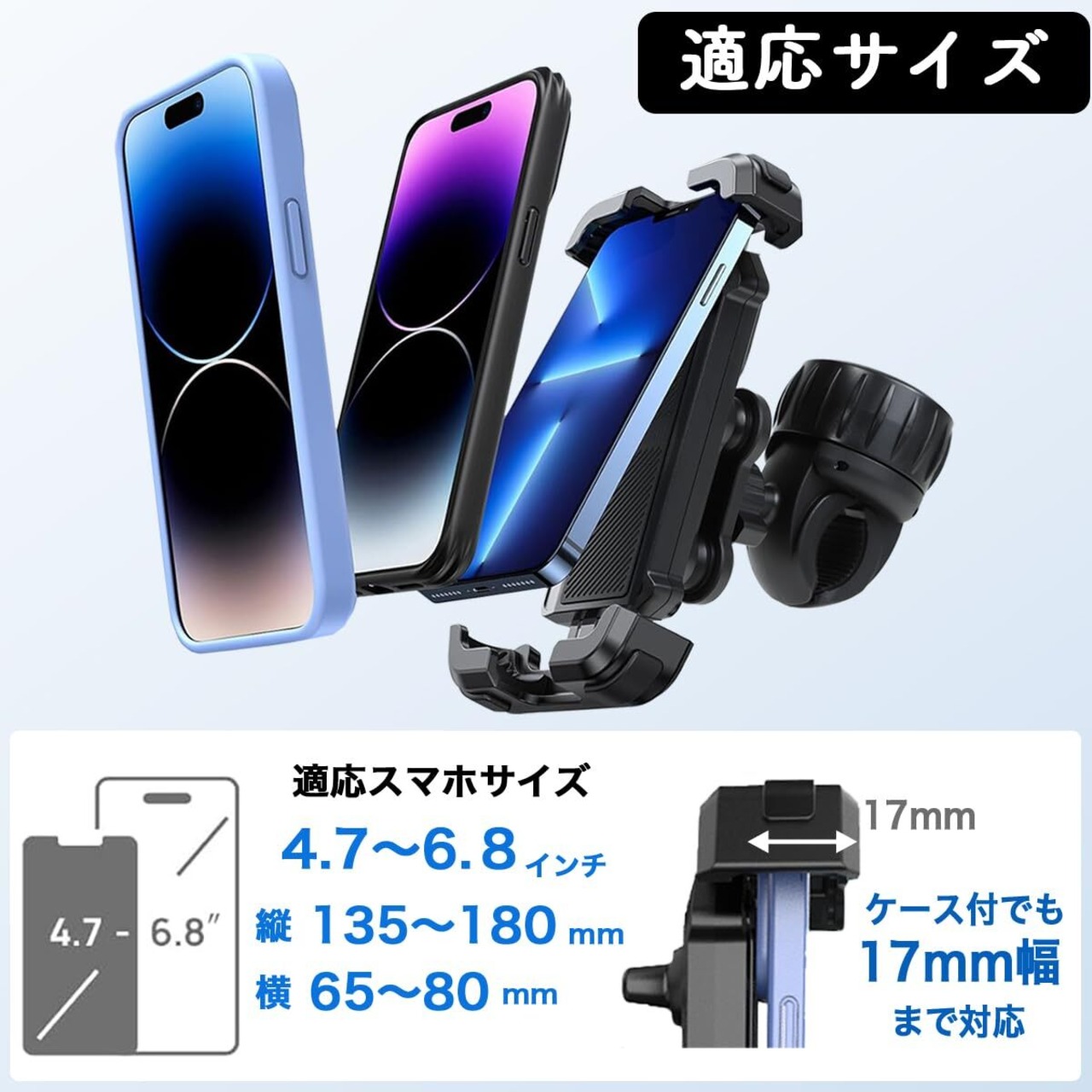 【適応サイズ】: (スマホートフォン) 縦幅:135〜180mm / 横幅: 65〜80mm /奥行: 〜17mm (ハンドルバー) ハンドルバー径 20〜38mm