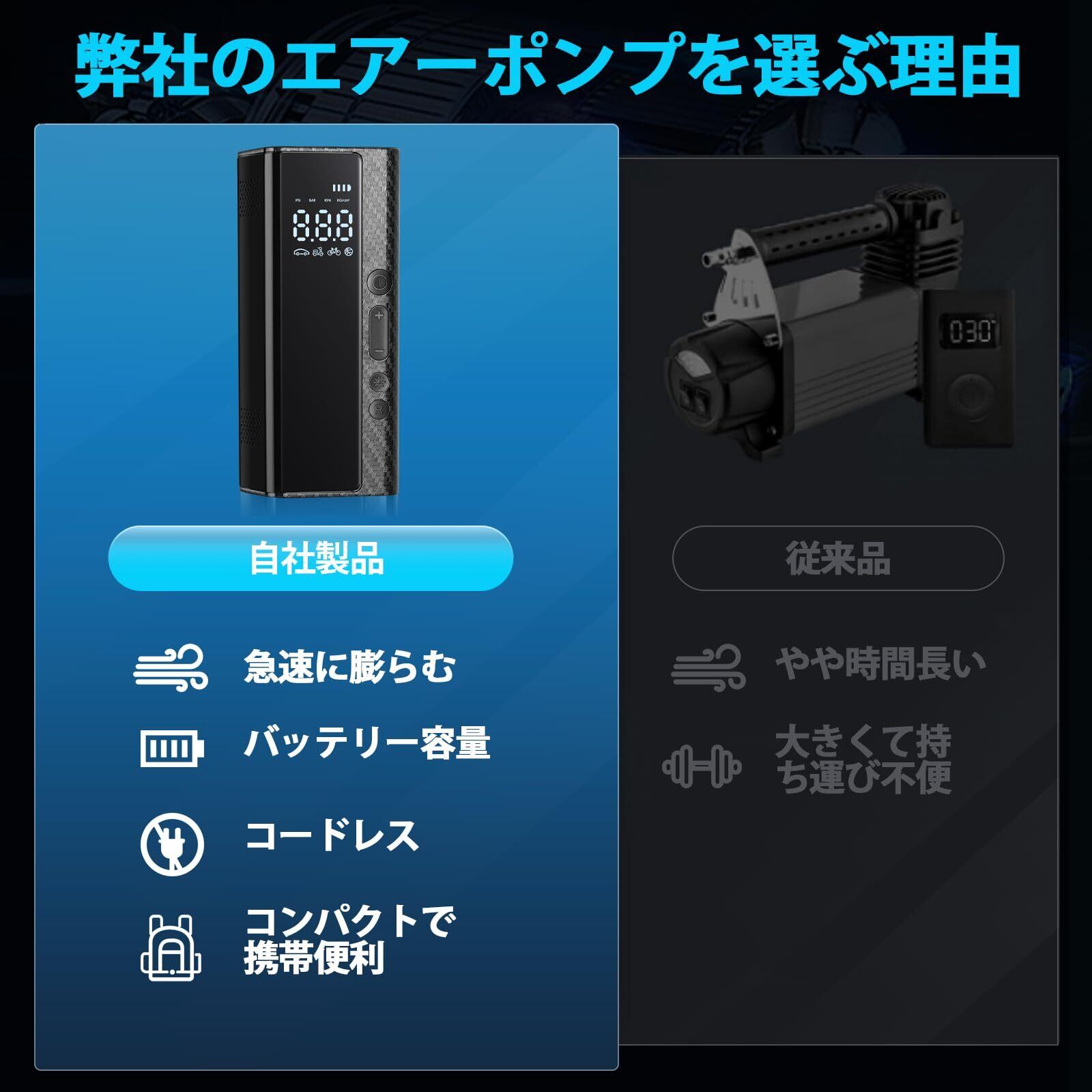 【4000mAH大容量バッテリー】2000mAh*2の高性能リチウムイオン電池内蔵、長寿命で安定して空気注入を実現!フル充電で自動車用タイヤに10回、バイク用タイヤに17回、自転車用タイヤに18回、バスケットボール用タイヤに45回空気を入れることができます。毎分20000回転のターボコンプレッサーとして効率が従来の電動空気入れより8倍も上がり、自動車やボールなどを1分以内に膨らませることができます。 車、バイク、自転車、ボールのタイヤなどさまざまな空気充填に適したアクセサリーがあります。旅のお供にもなりますし、運動場にも欠かせない空気入れです。