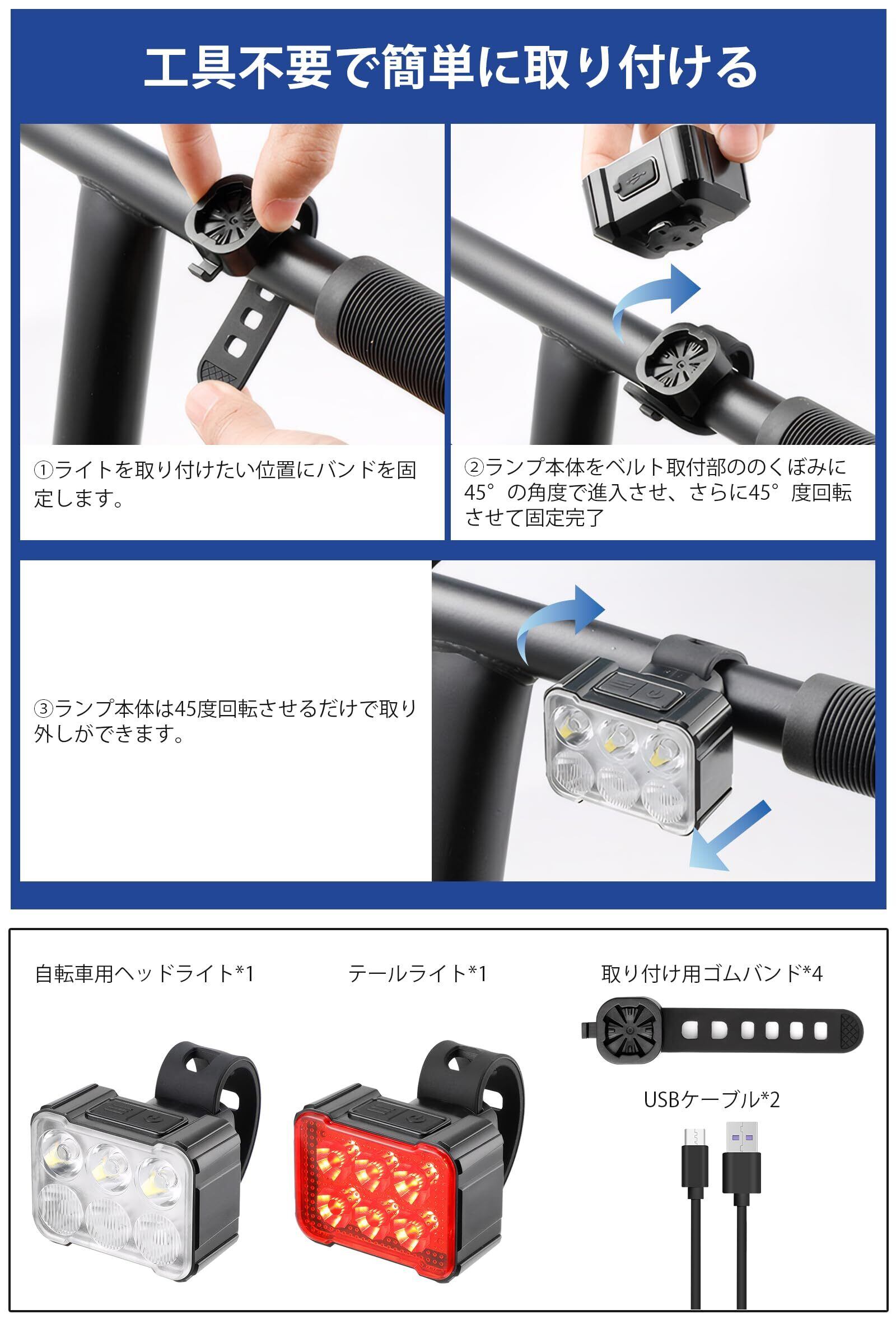 【8+12調光モード・防水】ヘッドライトは8種類、テールランプは12種類のライトモードがあり、お好みのモードに調節してロードバイクや自転車で走行する事が可能です。オンにしたときに前回使用した照明モードにデフォルト設定されているメモリー機能も設定されています。また、IPX4防水使用なので、小雨の日でも安心して使用できます!セット内容:自転車用ヘッドライト*1、テールライト*1、TYPE-C USBケーブル*2、取り付けゴムバンド*4、日本語説明書*1。