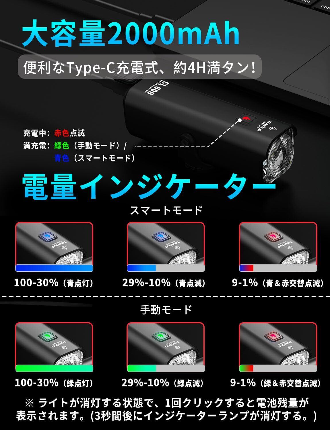 【USB-C充電式自転車ライト&大容量】:2000mAh 自転車 ライトはType-Cインターフェイスを採用し、充電時間が大幅に減少し、4時間で充電が完了します。充電タイミングが分かる電量インジケータが搭載され、電量不足の心配はいりません。