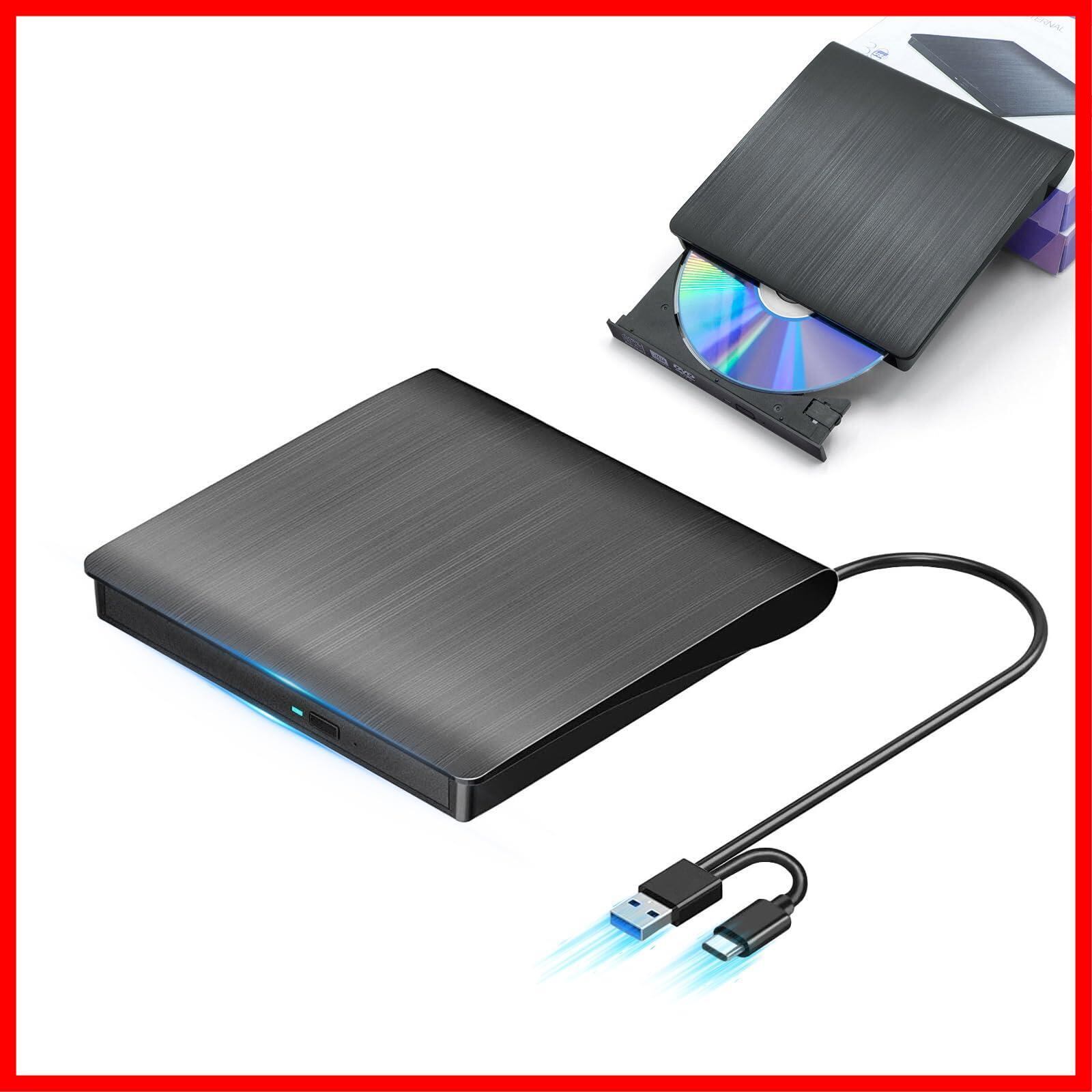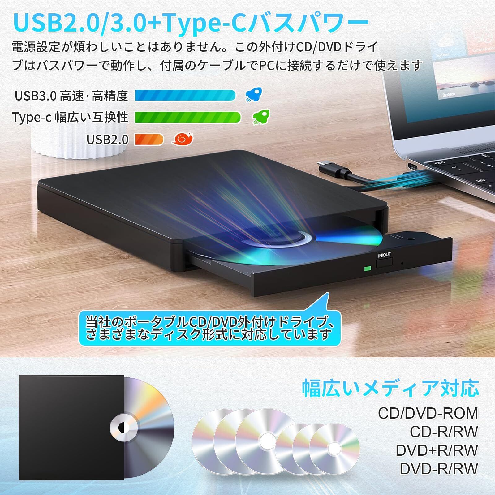 【特価商品】高速処理 8XDVD& 24XCD 光学ドライブ外付け 読取/書込可 バスパワー 外付けDVDドライブ USB 2.0/3.0&Type-C両接続 外付けCDドライブ (ブラック)