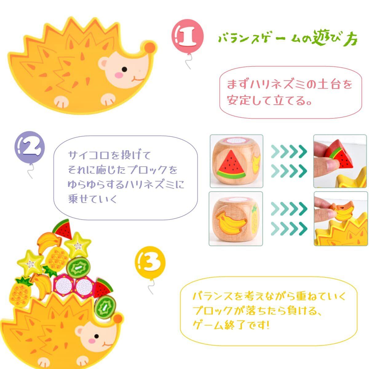 【バランスゲームと積み木おもちゃ】果物のブロックを積み重ねたり、並べてみたり、簡単な積み木として遊べます。バランスゲームとしては果物の形やバランスを考えながら重ねていく、集中力・思考力・バランス感覚など遊びながら身につきます。さらに、サイコロが付きますので親子または友達と一緒に対戦もできます!サイコロを投げてそれに応じたブロックをゆらゆらするハリネズミに乗せていく、ブロックが落ちたら負ける、ゲーム終了です!