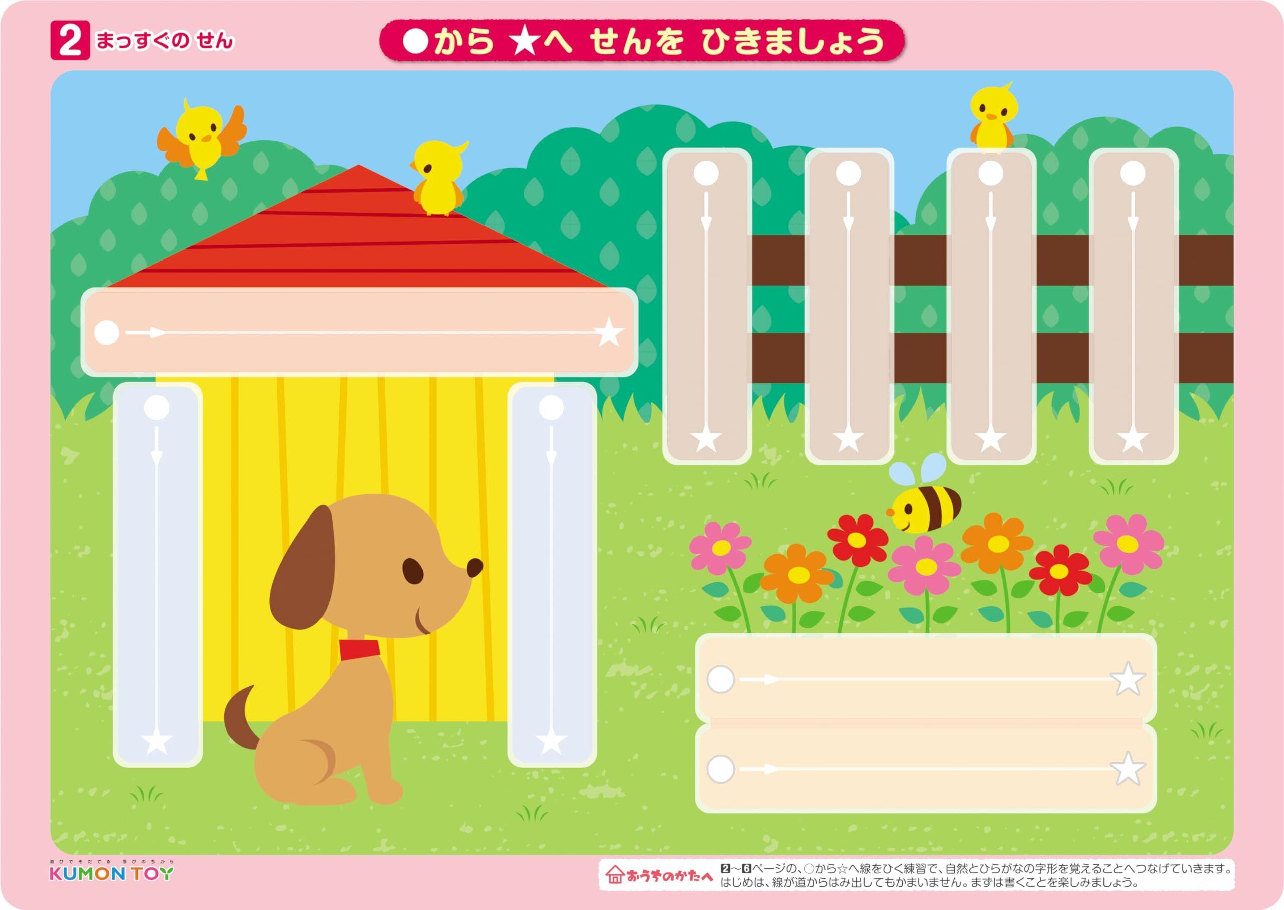 短い線から長い線へ、直線から曲線へと、少しずつ段階をふみながら、「鉛筆を自由に使いこなし、思い通りに引く力(基本運筆力)」を身につけましょう。