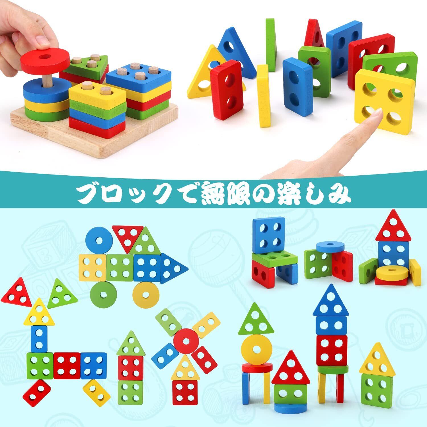 【知育・学習玩具】色々遊び方の木製おもちゃ ,✿スタッキングおもちゃ: お子様の手と目の協調性を向上させます。✿形合わせゲーム: お子様の形の認識を強化します。✿ビーズのおもちゃ: お子様の指先の力を鍛える。✿木製の時計: 初期教育における数学の数字の遊び方✿音楽鉄琴:子供の芸術的なセルのレンダリング。✿ツイストバグ: お子様の手の力を鍛えます。