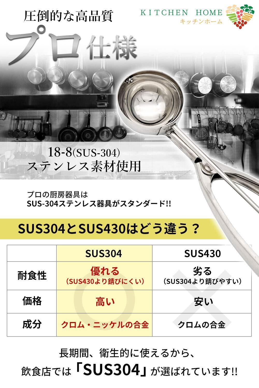 商標登録済み【第6299176号】調理器具では広く使われているSUS304オールステンレス素材の本格的なアイスクリームディッシャーになります。 耐熱性・耐食性に優れ、SUS430ステンレスよりも強度があり、食洗機にも対応しております。