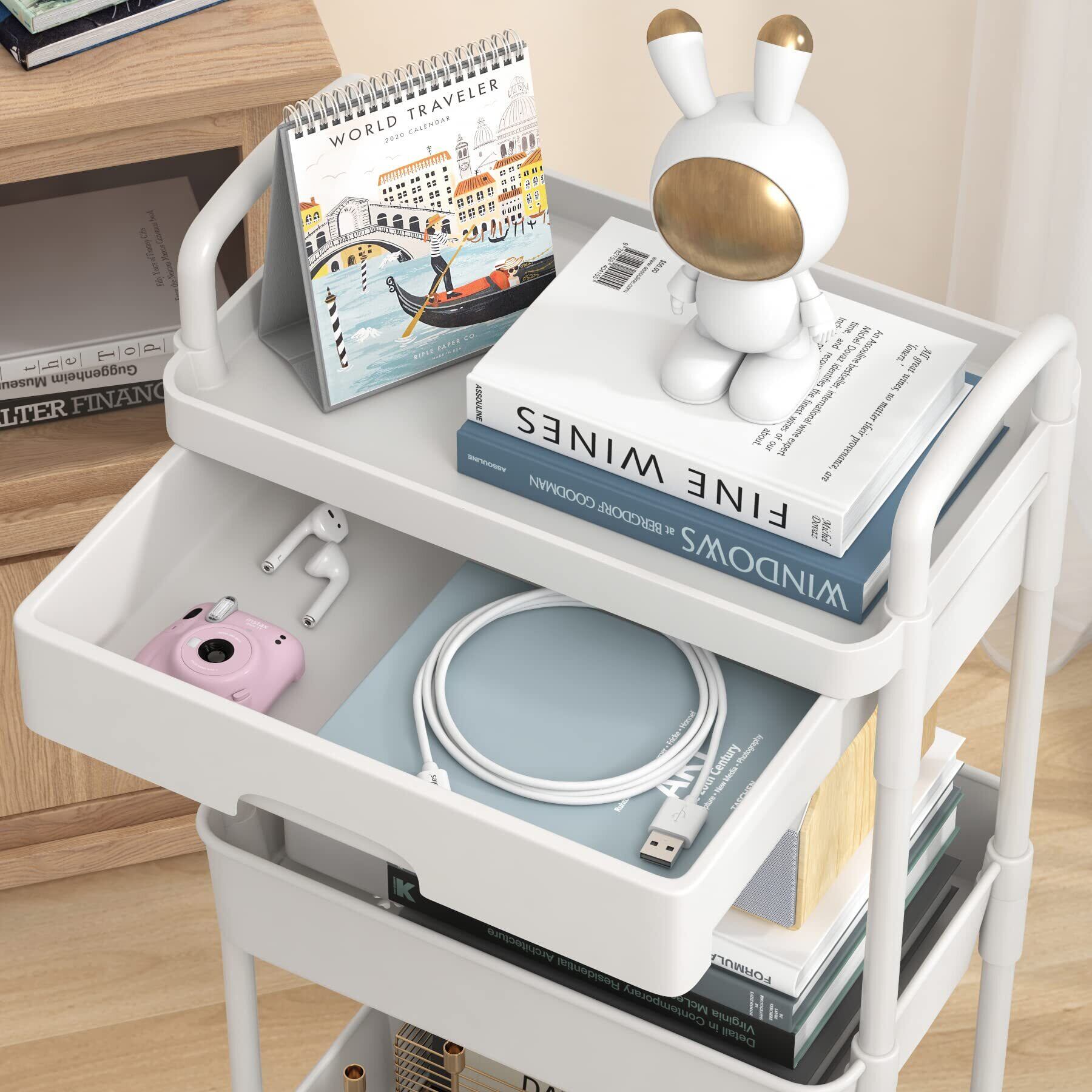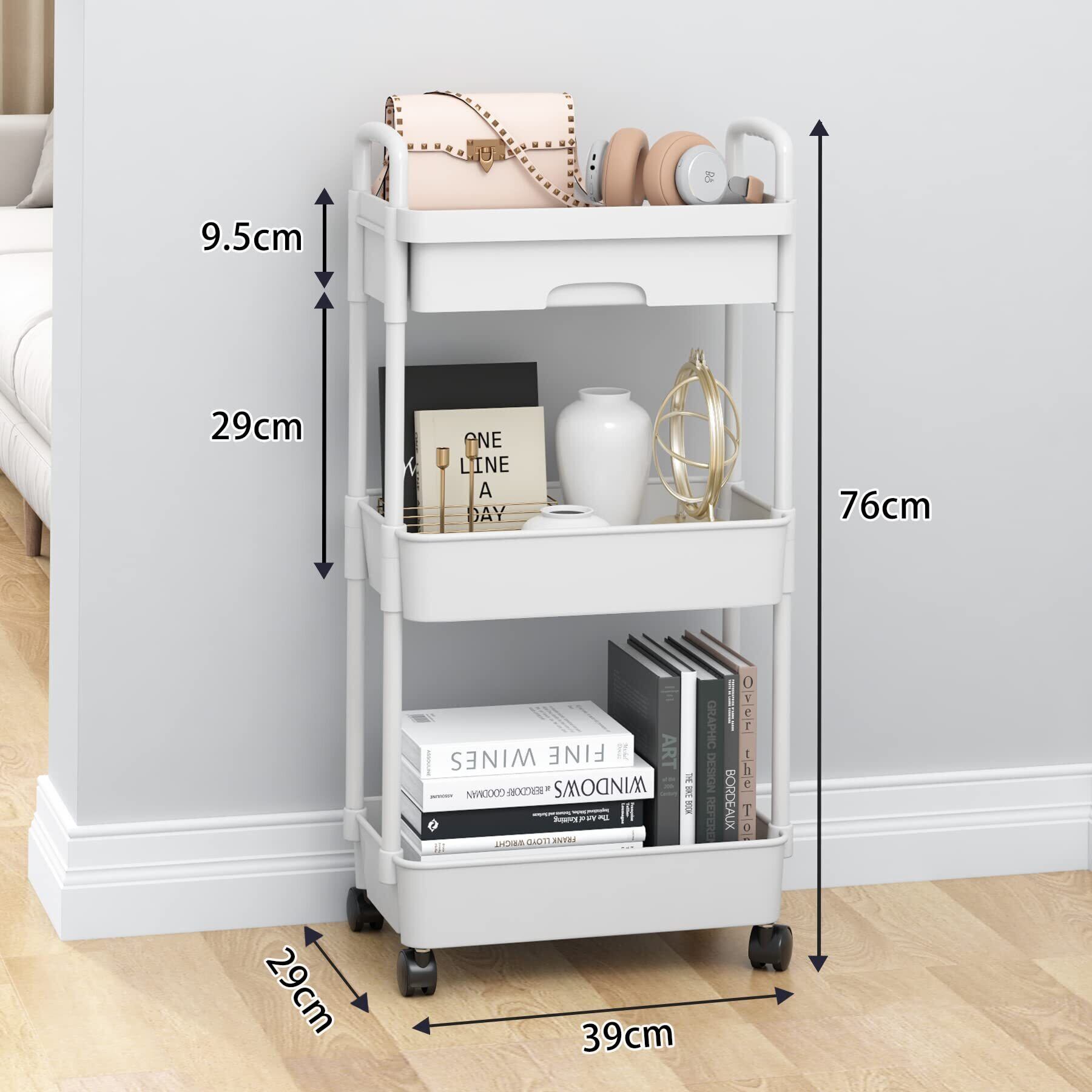 UDEAR 3層 プラスチック ローリング キッチンラック 引き出し付き モバイル ユーティリティ カート ハンドル付き 貯蔵 トロリー リビング ルーム バスルーム オフィス キッチン用 41*30*76 cm ホワイト-3