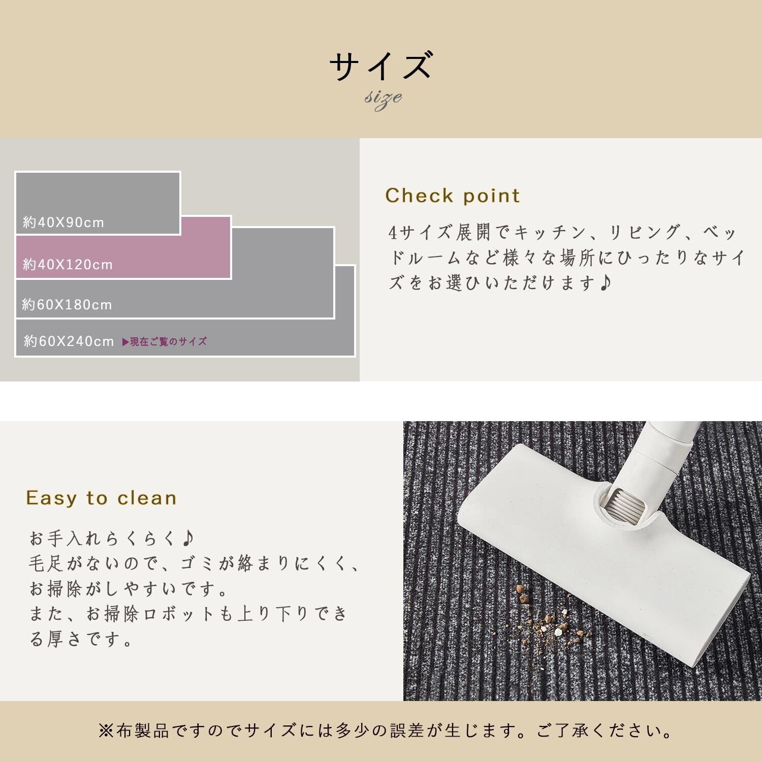 【商品規格】サイズ:60cm×180cm 、厚さ:7mm。水に強いポリエステル混紡素材で出来上がった拭けるタイプのキッチンマットで、耐湿性・速乾性が優れ、水や調味料、油がこぼれた際、お料理しながら切った細かい物を下に落として汚れてしまう時、タオルなどでサッと拭くだけで、ストレスフリーです。お洗濯不要だから、掃除機をかければゴミも簡単に取れるので、家事時間を短縮し、水道代、電気代も節約できます