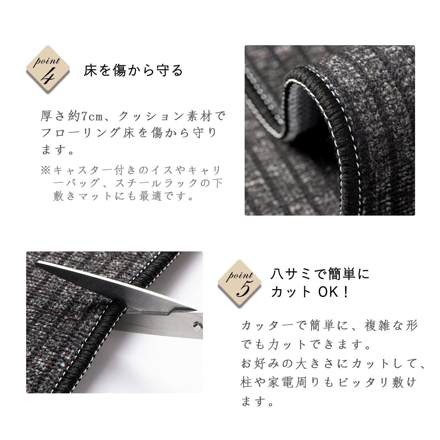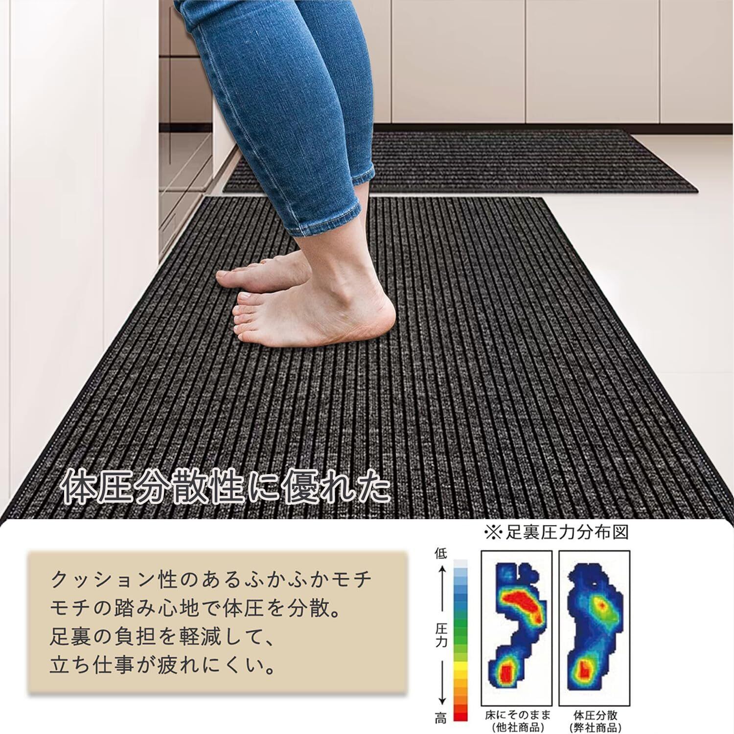 【踏み心地がいい】7mmの厚みで、足にかかる体重を分散し、素足で踏んでもクッション性があって、踏み心地がいいです。低反発のような柔らかさは期待でき、ふかふかして歩くのが気持ちいいです。ずっと立って洗い物をしても足が痛くなりません。腰への負担が少なく、長時間の調理が楽になります。物が落下しても衝撃を吸収し、床をキズやヘコミから守ります