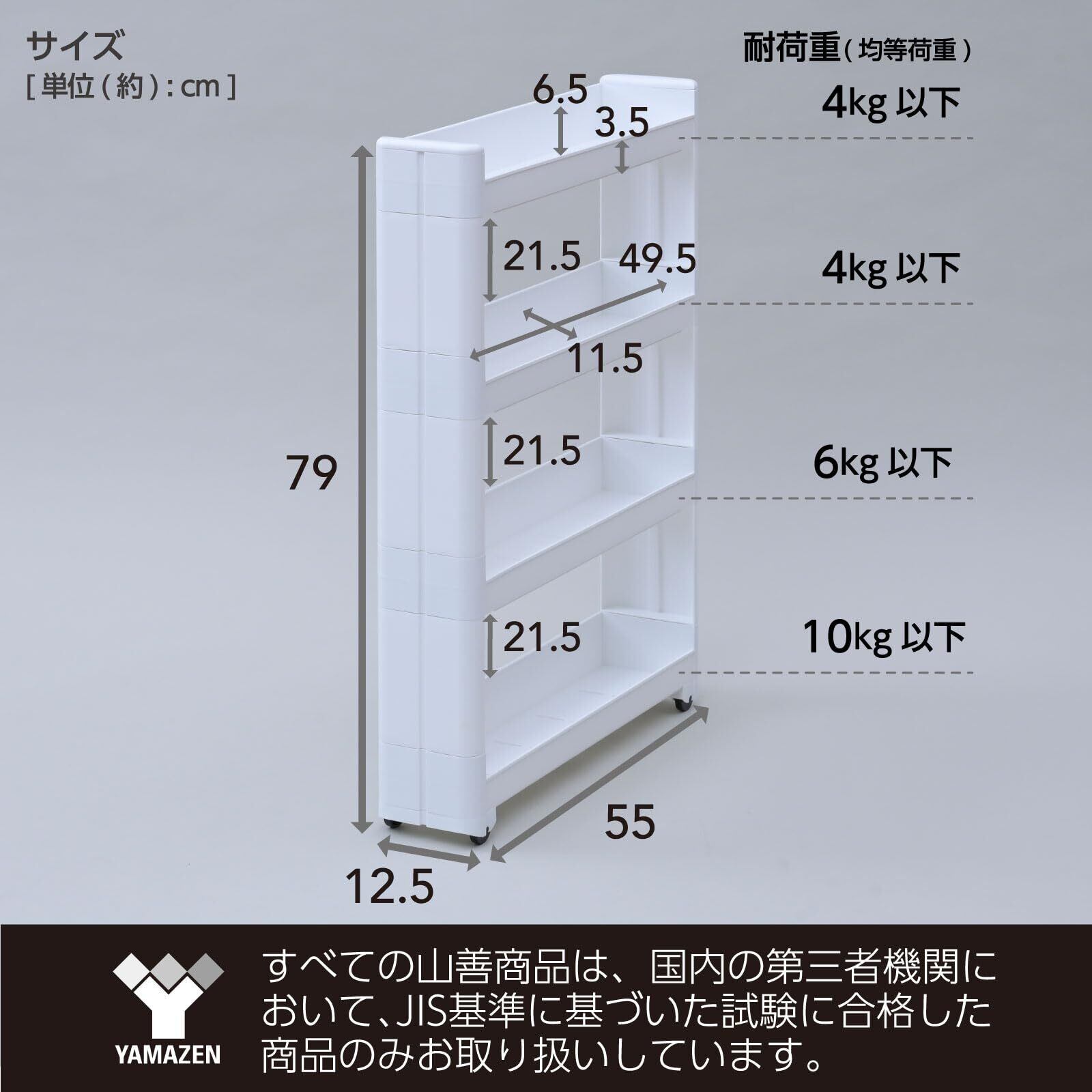 ●本体サイズ(約) : 幅12.5×奥行55×高さ79cm●カゴ内寸 : 幅11.5×奥行49.5×高さ6.5/3.5cm(カゴの壁が一方は高く、もう一方は低くなっています。)●内寸高さ : 各段21.5cm●耐荷重(均等荷重) : 棚板(上段)/4kg以下、棚板(中段 上)/4kg以下、棚板(中段 下)/6kg以下、棚板(下段)/10kg以下●材質 : ポリプロピレン●東証プライム(株)山善で扱うすべての山善商品は、自社もしくは第三者機関において、JIS規格に基づいた品質試験を行っております。
