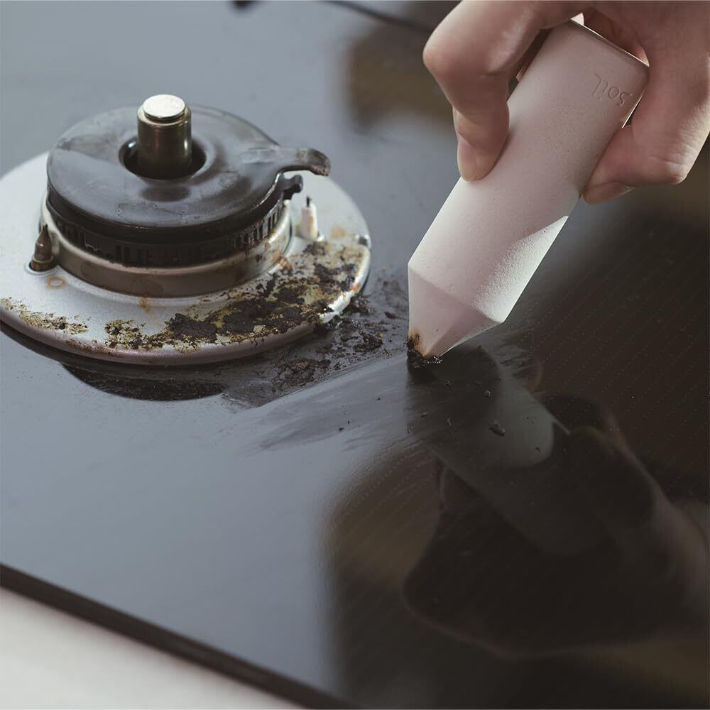 IHのガラストップにも使え、洗剤などを使用しなくても水に濡らして擦るだけで焦げ跡が取れます。油汚れに有効なクエン酸と珪藻土を中心とした、数種の研磨剤が頑固な汚れ、焦げ跡を綺麗に取り去ります。棒状で握り安く、使いやすい形状となっています。使用後は先端についた油汚れを洗剤などを付けて洗い、乾かして下さい。