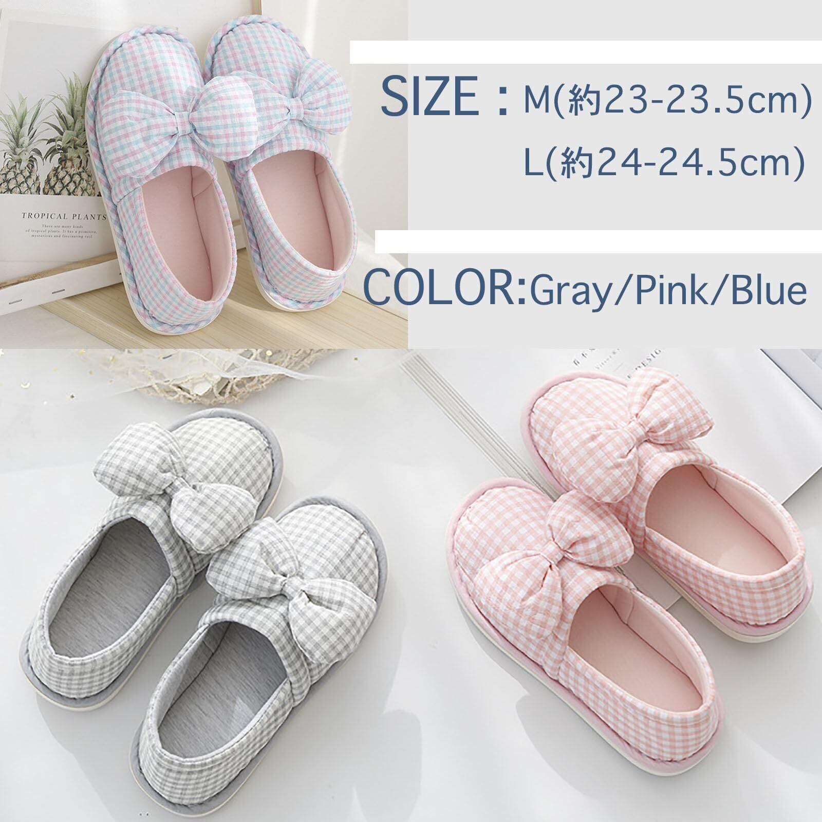 サイズ:M_色:ブルー[ソユル] リボン ルームシューズ 室内履き スリッパ チェック柄 かかと 付き あり 滑り止め 入院 院内 介護 リビング キッチン レディース