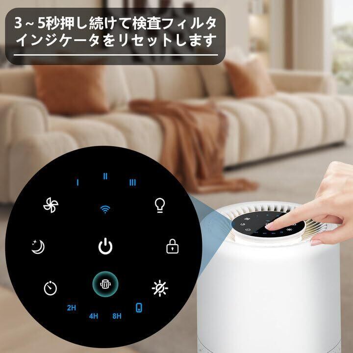 【多層高性能フィルター】プレフィルターはペットの毛や粗大なホコリを99.99%除去します。高品質の個人用静電HEPAフィルターは、ウイルス、細菌、微細なホコリ、タバコの煙、花粉、アレルゲン、カビ、家庭用ダスト、PM2.5など、0.1μmの微粒子を98.99%除去します。