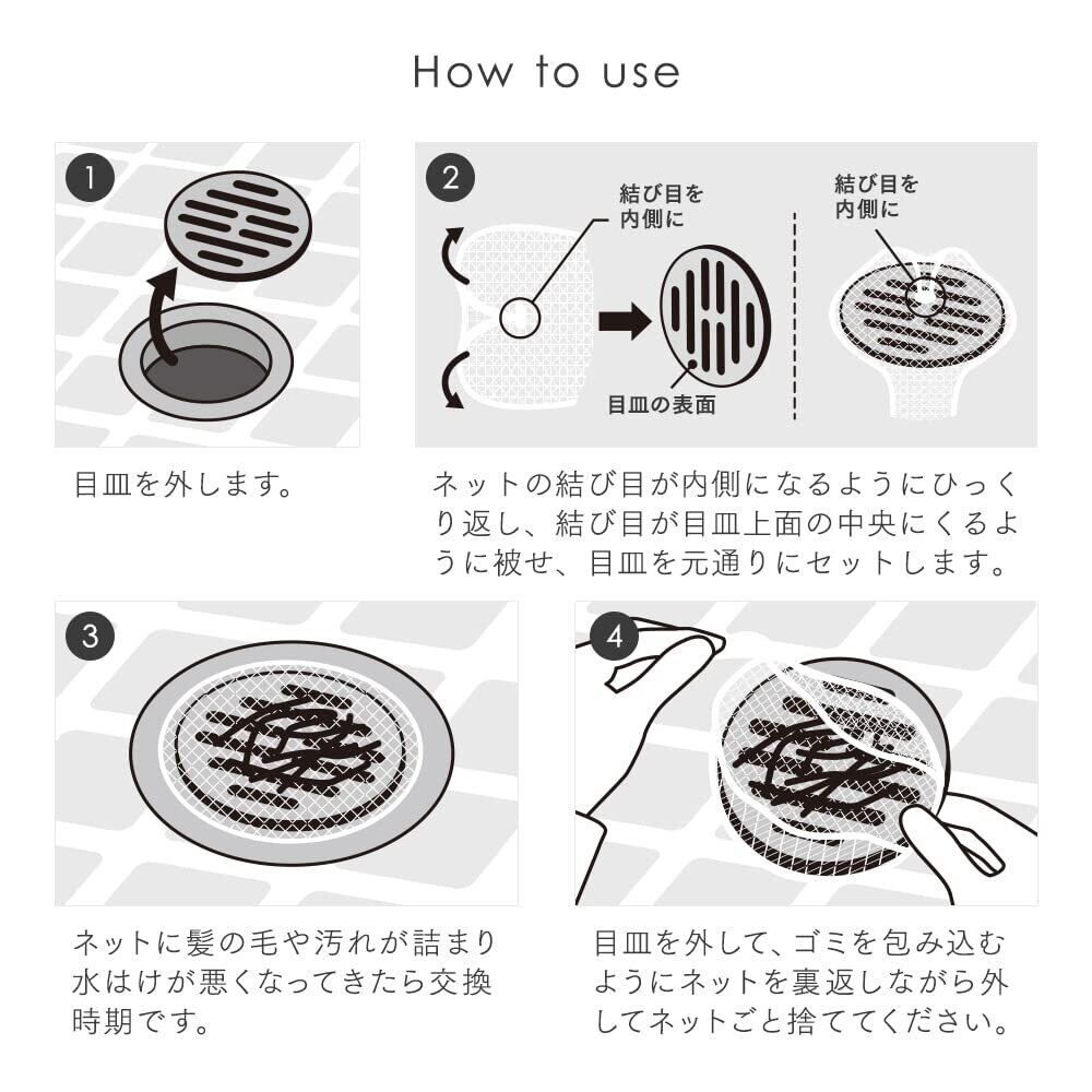 【使用方法】①目皿を外します。②ネットの結び目が内側になるようにひっくり返し、結び目が目皿上面の中央にくるように被せます。ネットを被せたままで目皿を元通りにセットします。③ネットに髪の毛や汚れが詰まり、水はけが悪くなってきたら交換時期です。④目皿を外して、ゴミを包み込むようにネットを裏返しながら外してネットごと捨ててください。