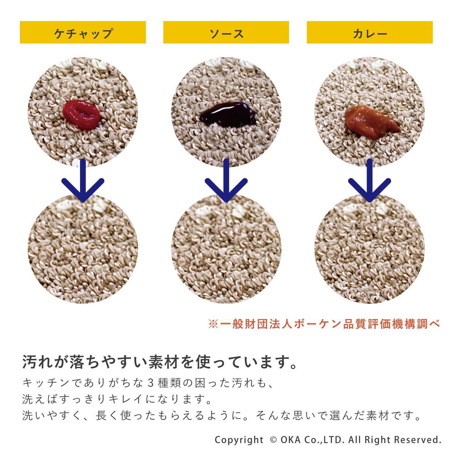 毎日使うキッチンでの汚れ、ケチャップやソースなどの汚れが付いてしまってもお洗濯するとシミも残りにくく清潔に長くご使用頂ける魅力も。