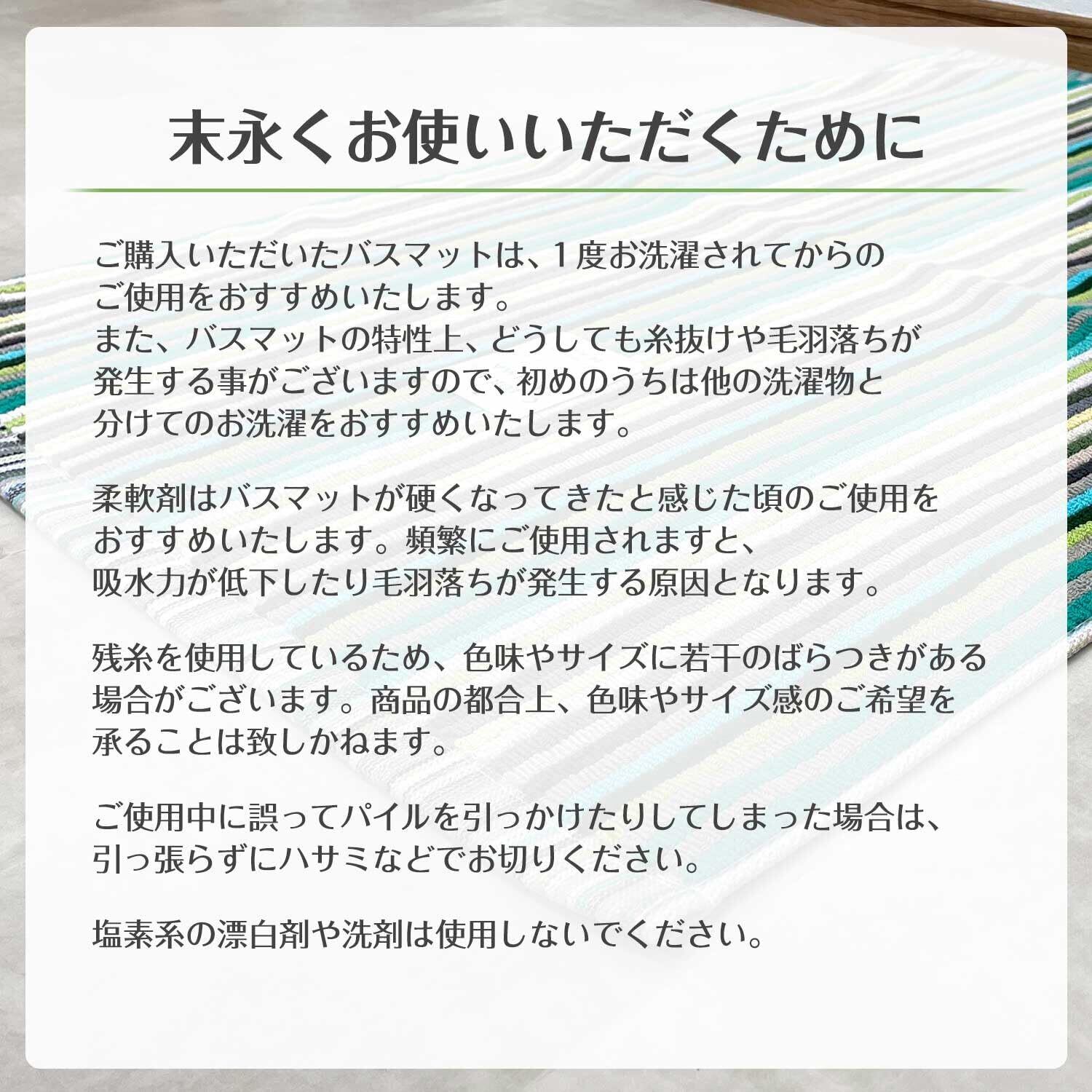 【残糸で作ったエコなタオル地バスマット】タオルを作る際に必ず出てしまう余り糸を使って織り上げました。一枚一枚少しずつ風合いの違うバスマットです。両面パイル地で吸水性・乾きやすさUP。引っ掛かりにくいショートパイルで使いやすく、汚れたらすぐに洗濯機で丸洗いできるのでいつでも清潔にご使用いただけます。