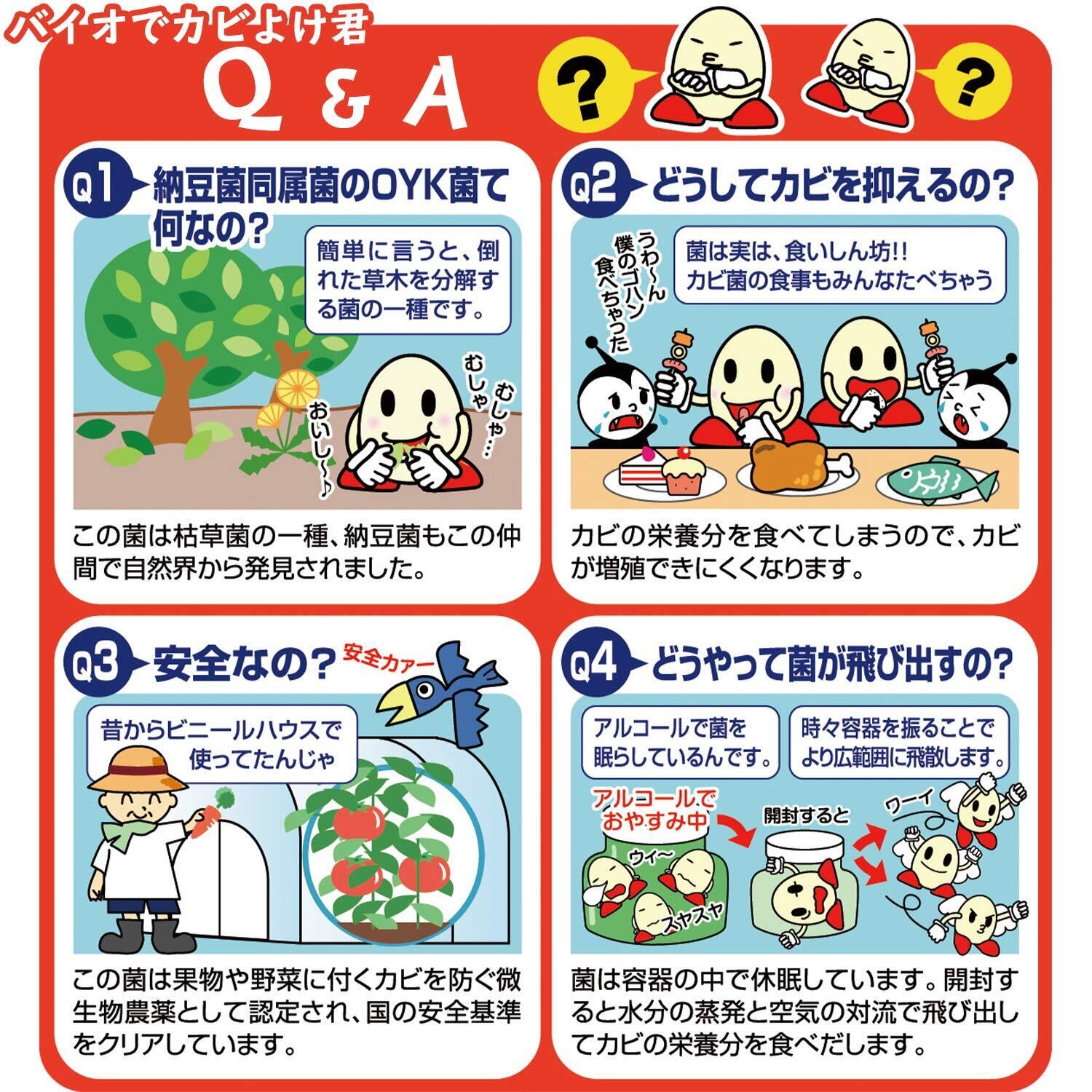 ●天然バイオがカビの発生を抑制!お風呂場や洗面所などカビが発生しやすい場所付近に置いてください。使い方は簡単、カビや汚れをお掃除で一旦落としていただいた後に「カビよけ君」を設置してください。有効微生物の納豆菌同属菌(OYK菌)が付近のカビ発生を抑える