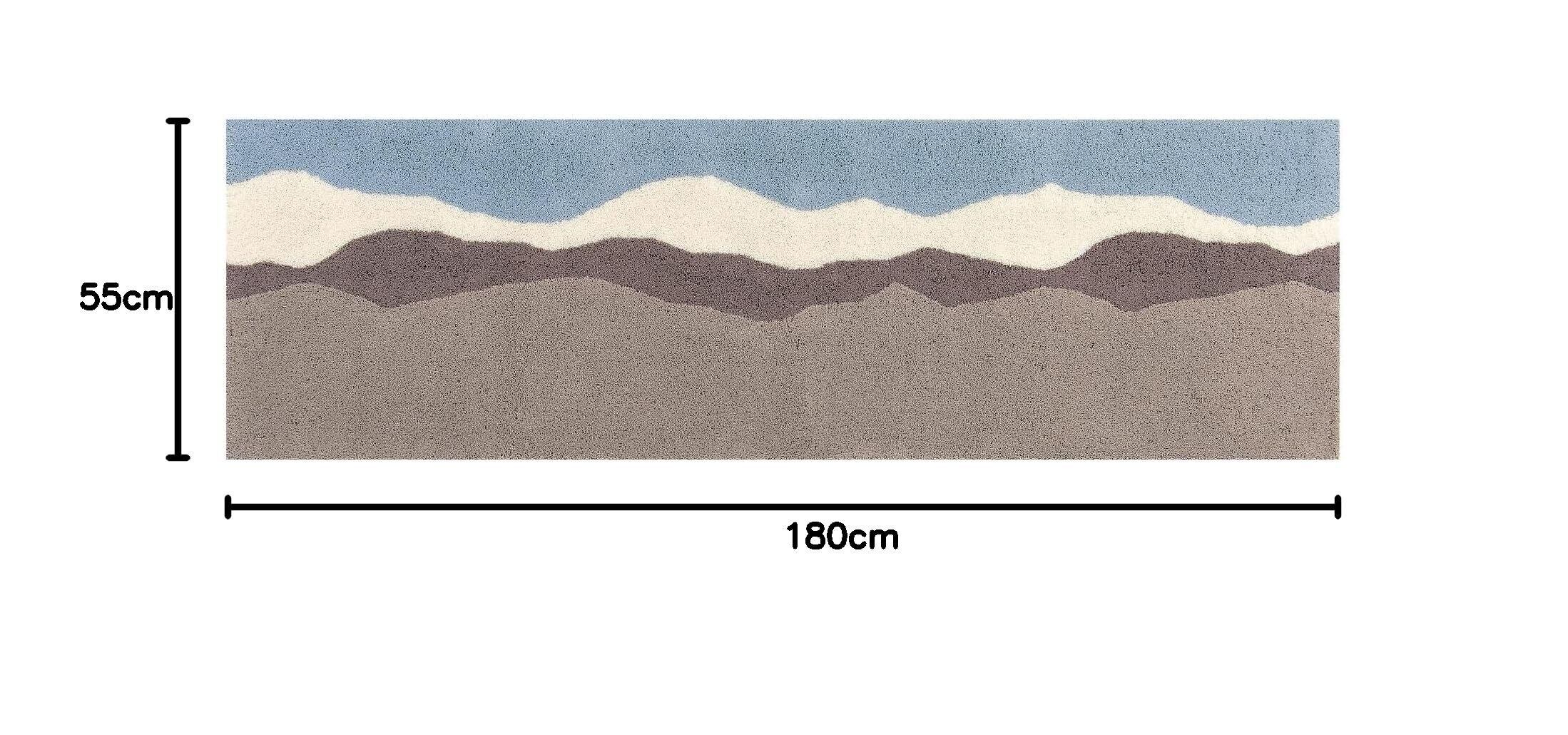 遠景に空と山、手前に広大な農場がひろがるイメージを、揺らぎのある抽象的なボーダーデザインにアレンジしました。シックなスモーキーカラーとゆらゆらとしたラインが、空間にモダンに映えるデザイン。キッチンマットやベッドサイドマット、玄関マットにおすすめの長尺サイズ。日本製。裏面すべりにくい加工。洗濯機洗い可(タンブラー乾燥はできません)。