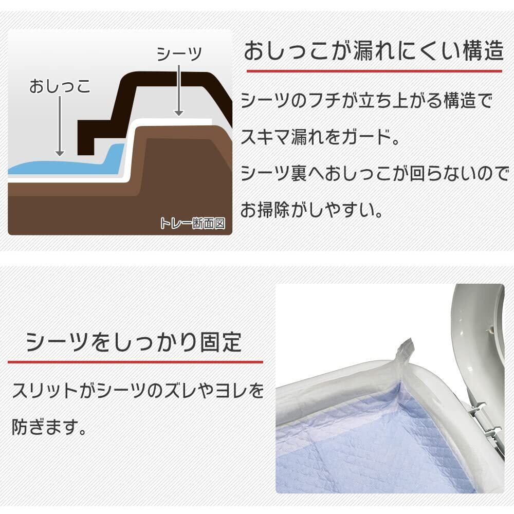 おしっこのフチもれを解決するトレーニングペットトレーです。 シーツのフチが立ち上がる仕様で、おしっこがシーツ裏へ回り込むのを防ぎます。 コーナーのスリットでしっかりシーツを固定し、ズレやヨレを防ぎます。 しつけに最適なメッシュスノコ付きで、シーツのひっかきやおしっこ後の足ぬれを防止します。