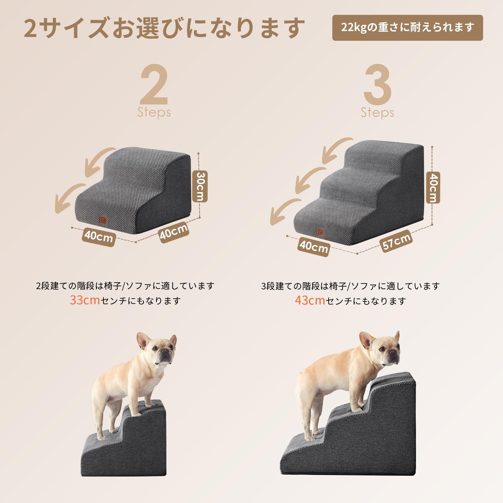 【2つのステップサイズ】この犬用階段には2つのステップと3つのステップがあります。2つのステップは約33センチの椅子/ソファ/ベッドに適しています。3つのステップは約43センチの椅子/ソファ/ベッドに適しています。