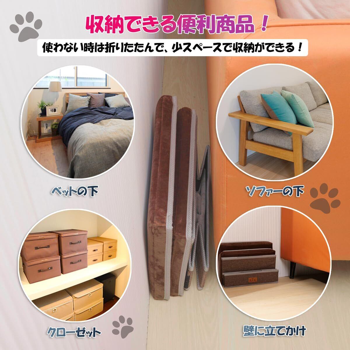 ●収納型のドックステップで、ワンちゃんの服や小物、飼い主様の荷物など、スペースを活用して収納いただけます。 ●チップウレタンと違い、1枚物のウレタンシートを使用している為、 適度な硬さとクッション性で足腰の負担を軽減します。 ●1段目が奥行27.5cmと幅広サイズになっており、階段の勾配が緩やか。 ●コンパクトサイズで場所をとりません。 ●使わないときは折り畳んでおく事も可能です。 ●軽量型で組み立ても簡単!